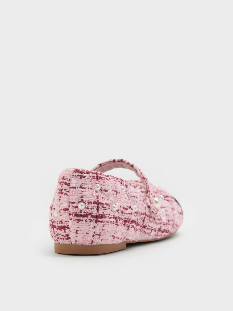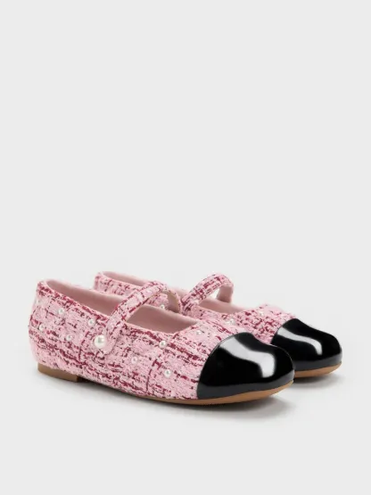 These Mary Jane flats for girls in pink are made with tweed and feature pearl embellishments, cap toes and slim straps. Use them to bring polish and sweetness to your little one's special-occasion outfits.