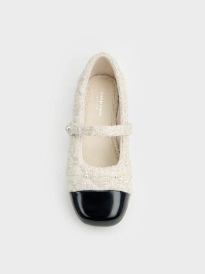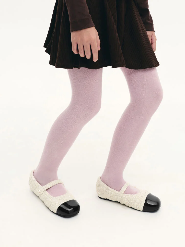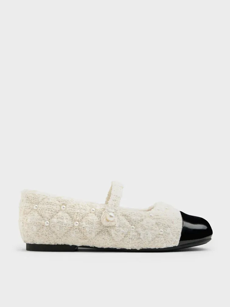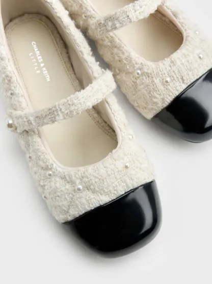 These Mary Jane flats for girls in white are made with tweed and feature pearl embellishments, cap toes and slim straps. Pair them with your little one's favourite dresses for girlish charm.