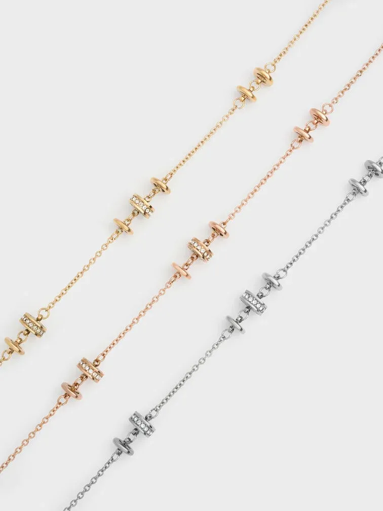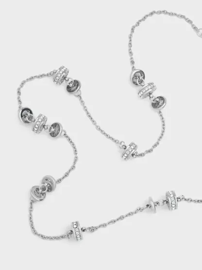 This Hermione choker necklace in silver features small crystal-embellished details that sit elegantly on a thin, delicate chain. Stack this choker with a pendant necklace for an eye-catching layered combination that will make you stand out.