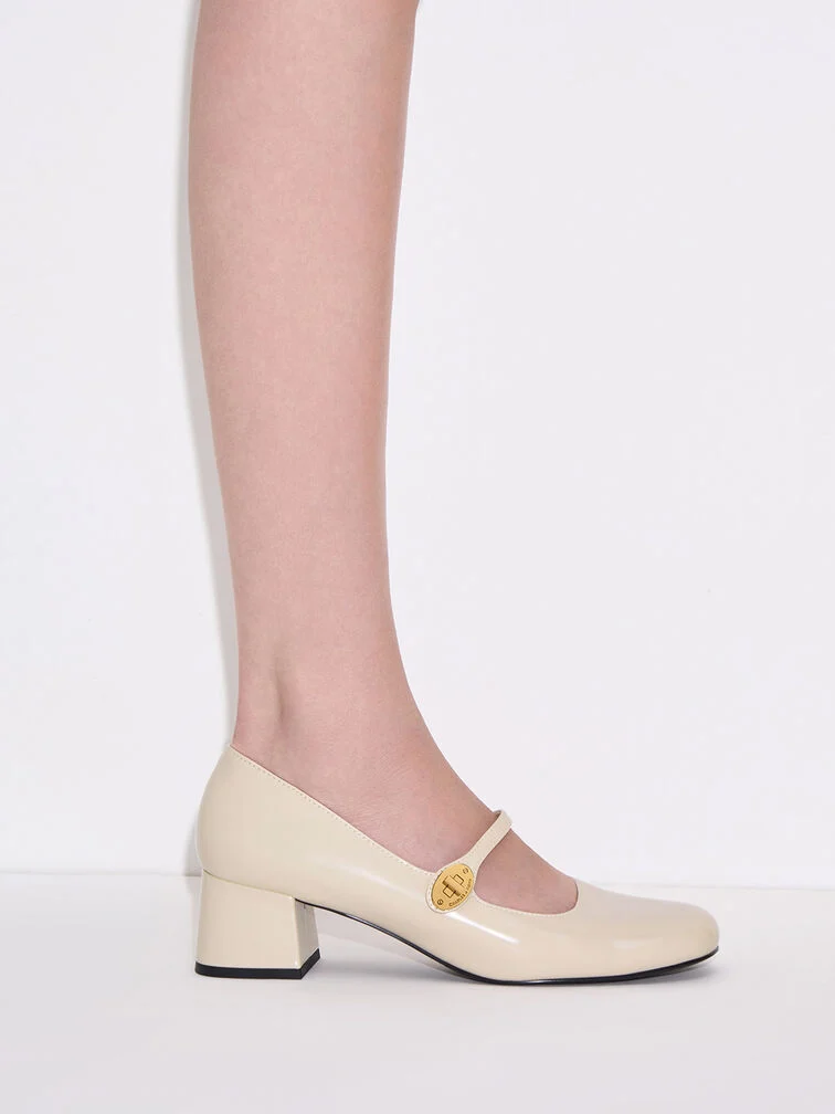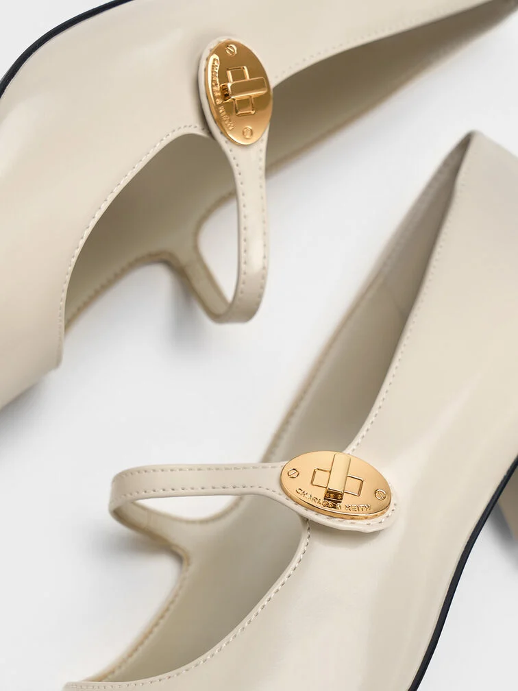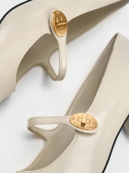 Timeless and elegant, this pair of Mary Janes features a rounded square-toed silhouette and a glossy white finish for a polished, effortlessly stylish look that is suitable for most occasions. Other eye-catching details include the brass turn-lock accents on the delicate straps and block heels for a sturdy stature boost.