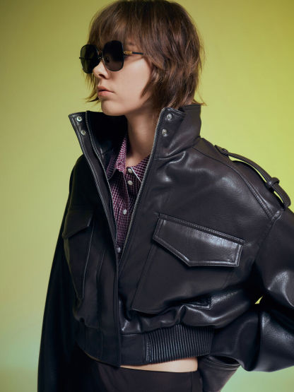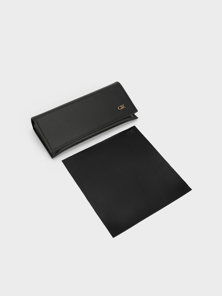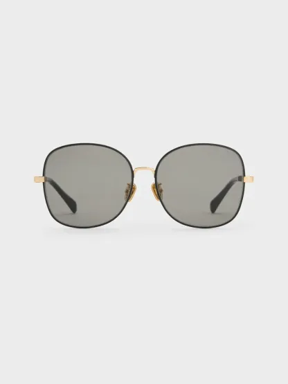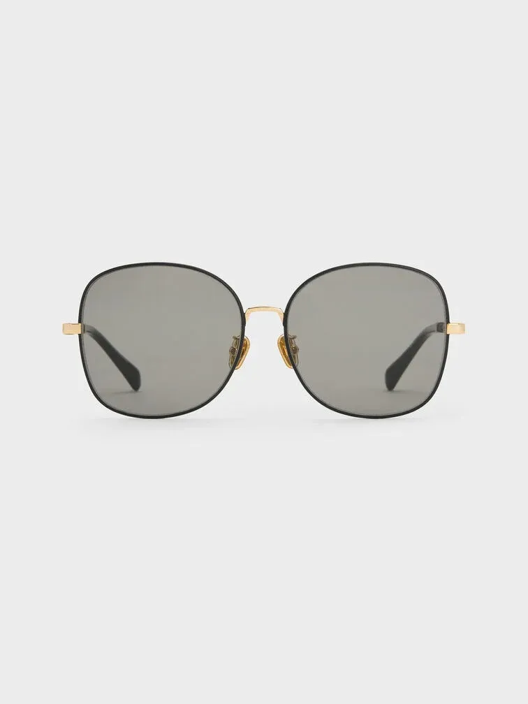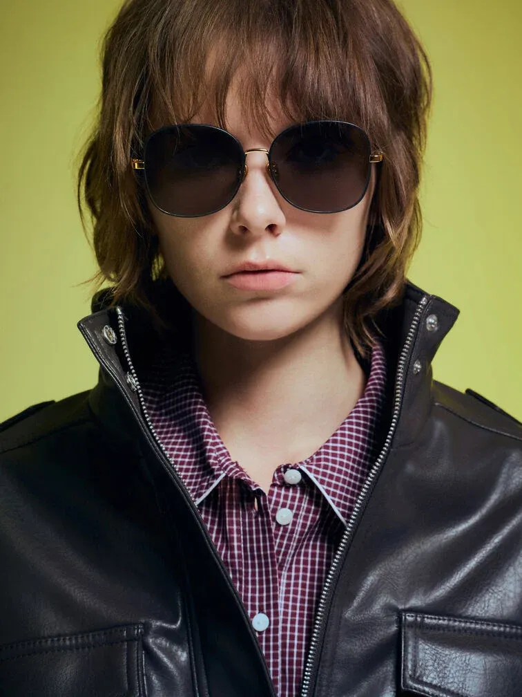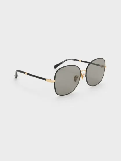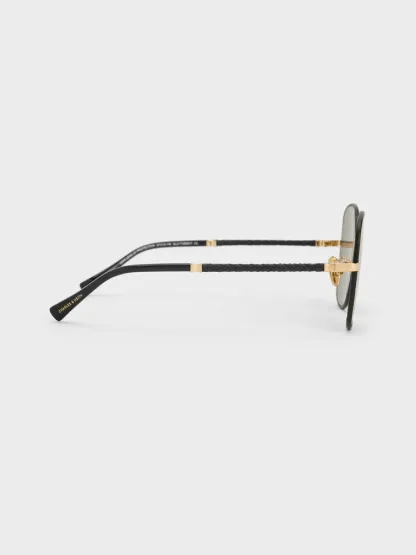 These Ivette butterfly sunglasses in black are made with genuine leather. They feature leather braided temples and leather rims, elegantly curved tinted lenses and subtle metallic accents. Complement your look with these sophisticated shades for a touch of timeless glamour.