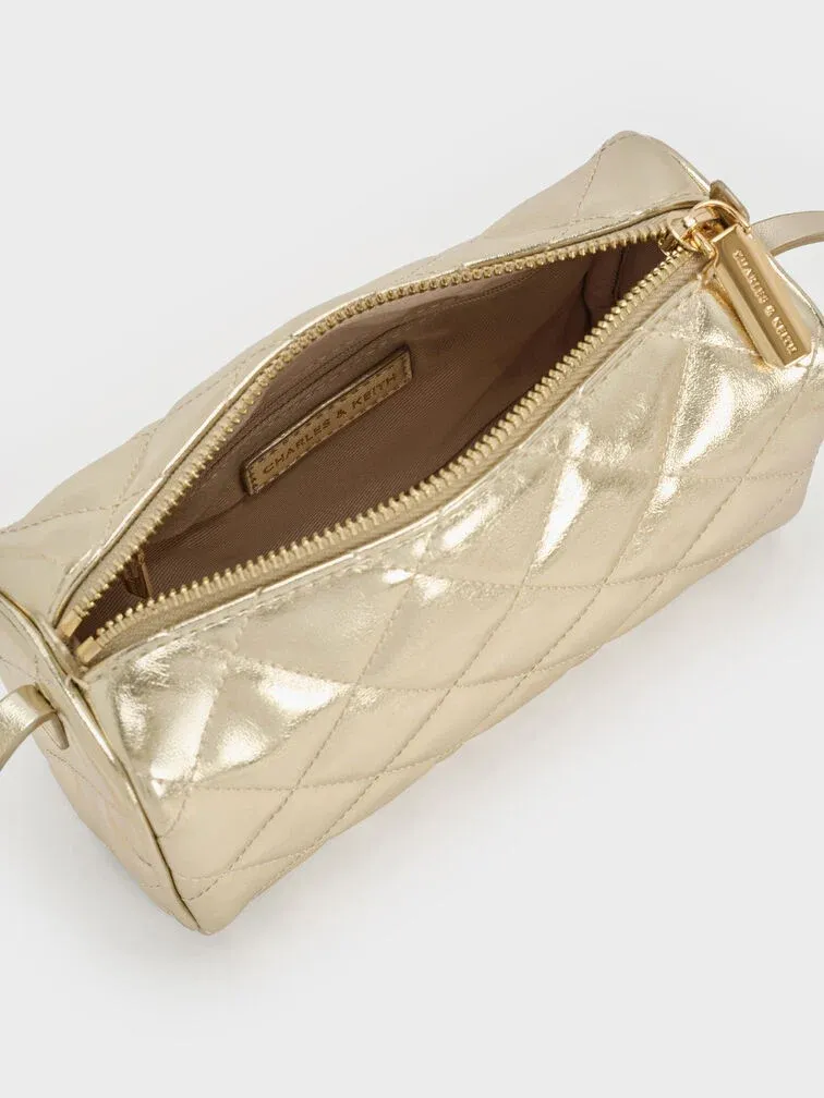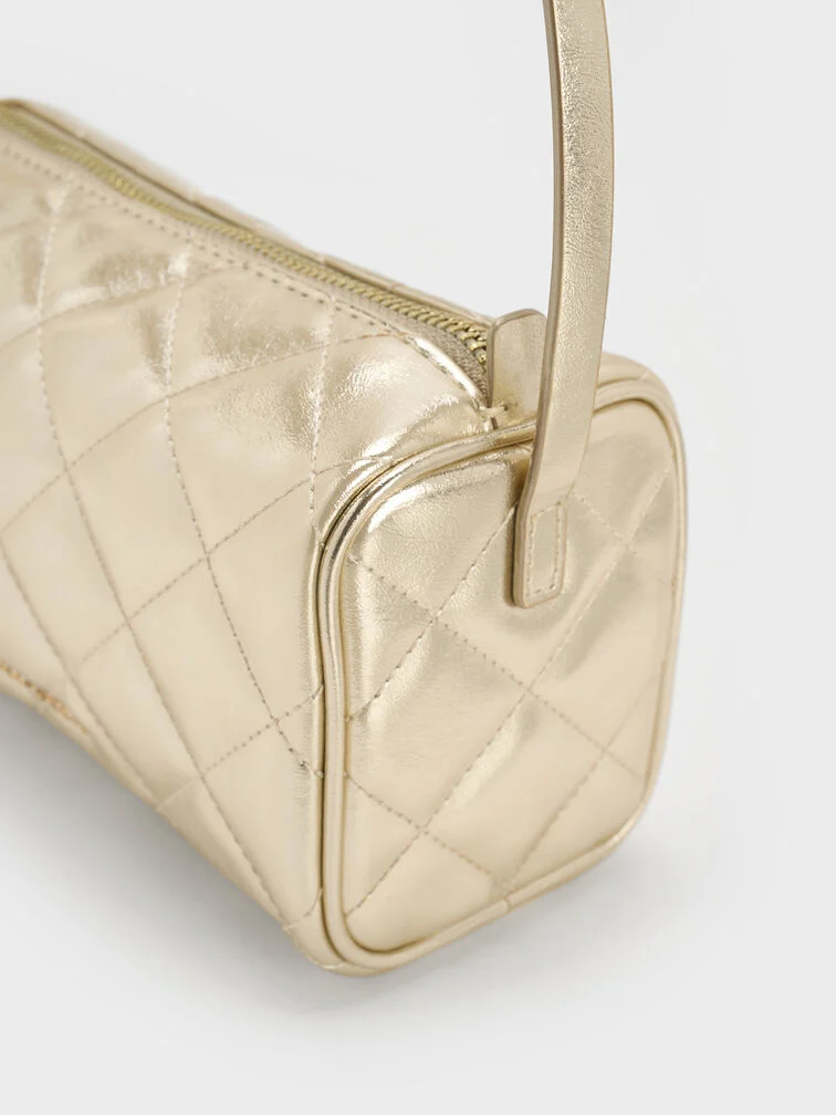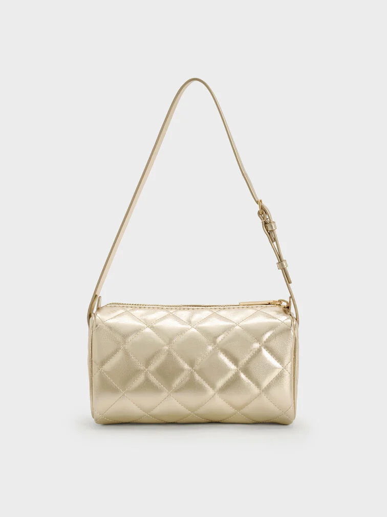 This Janie shoulder bag in champagne features a metallic quilted finish, a rectangular silhouette, a single adjustable strap and a zip closure. Wear it to elevate evening and special-occasion looks with stylish shine.