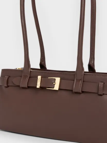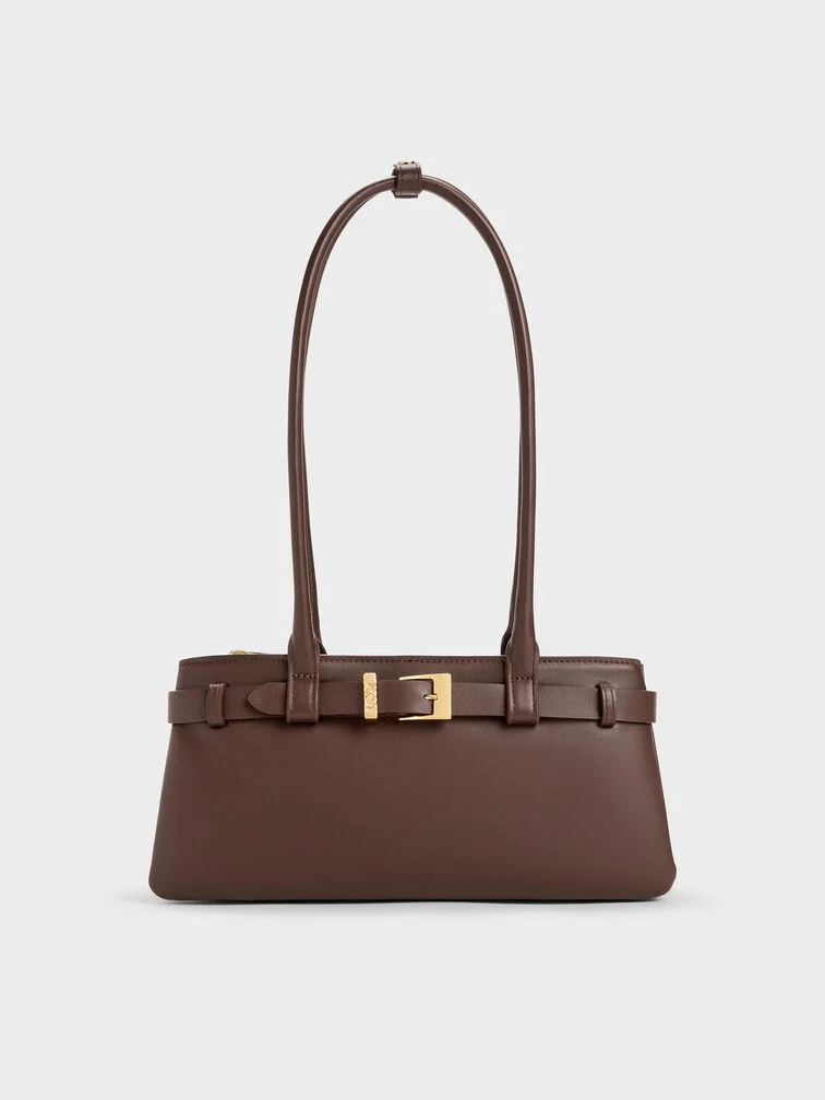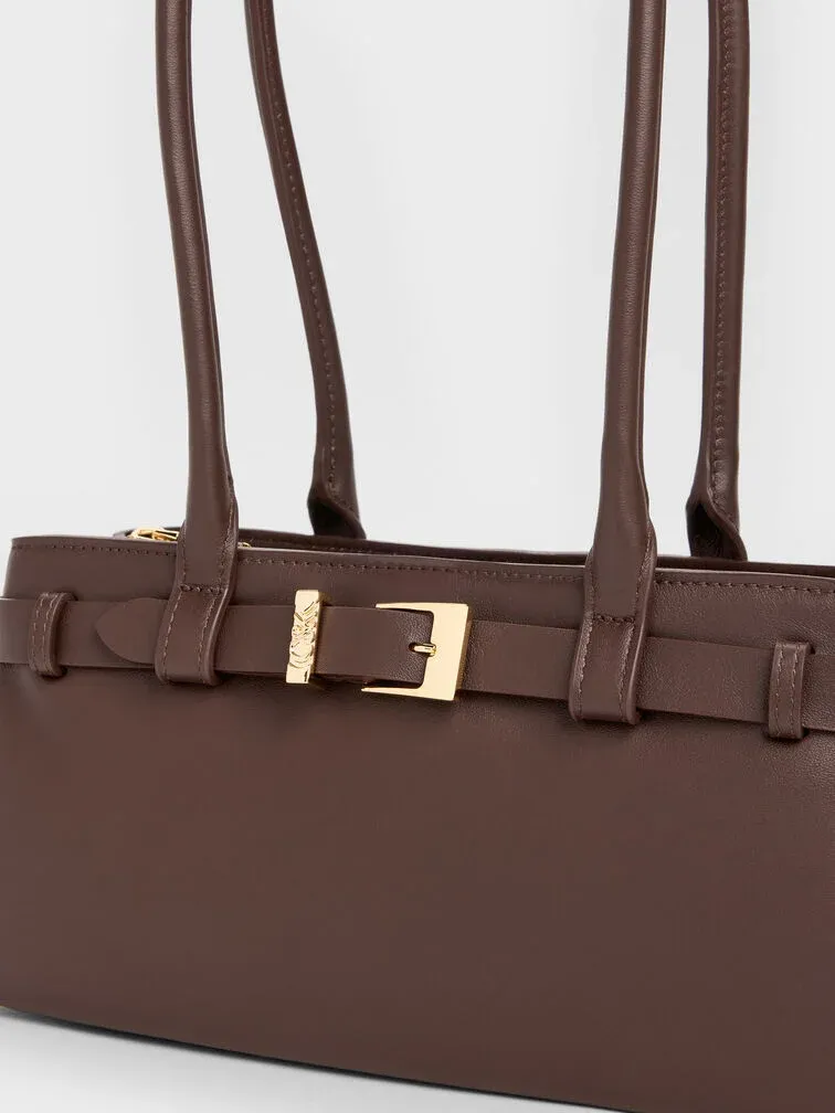 This Jody shoulder bag in dark brown is made with genuine leather and features a distinctive belted detail and a sophisticated trapeze silhouette. Let it bring structure and sophistication to your go-to workday looks.