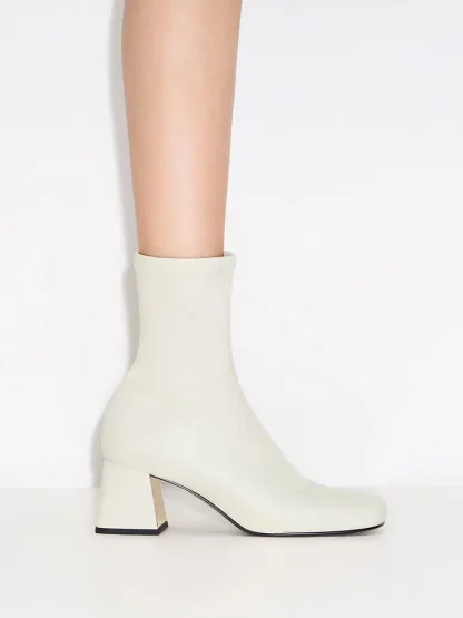 This pair of sophisticated ankle boots have all the features we love about the classic fall shoe style - covered round toes, subtle stitch-trim details, and a side-zip design that makes them easy to put on and take off. Complete in an elegant, all-white hue and metallic gold trapeze block heels, the small but striking details imbue them with a subtly luxurious flair that will put the perfect finishing touch on any ensemble.