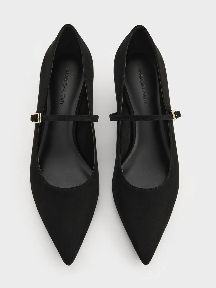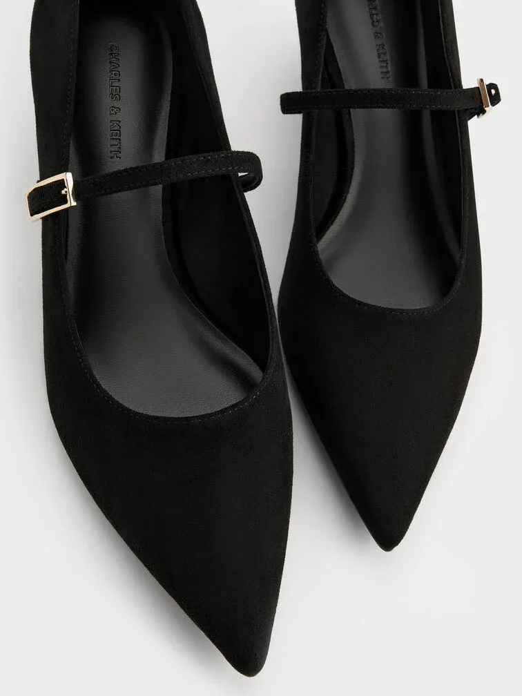 These Luciana Mary Jane pumps in black are made with faux suede and feature pointed toes, dainty kitten heels and thin adjustable straps. Wear them with lightweight dresses for a feminine and versatile summer look.
