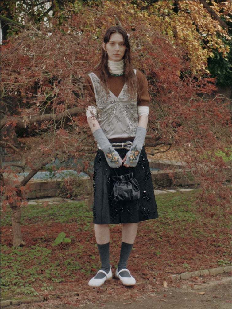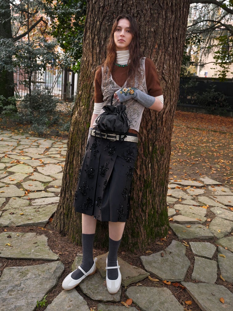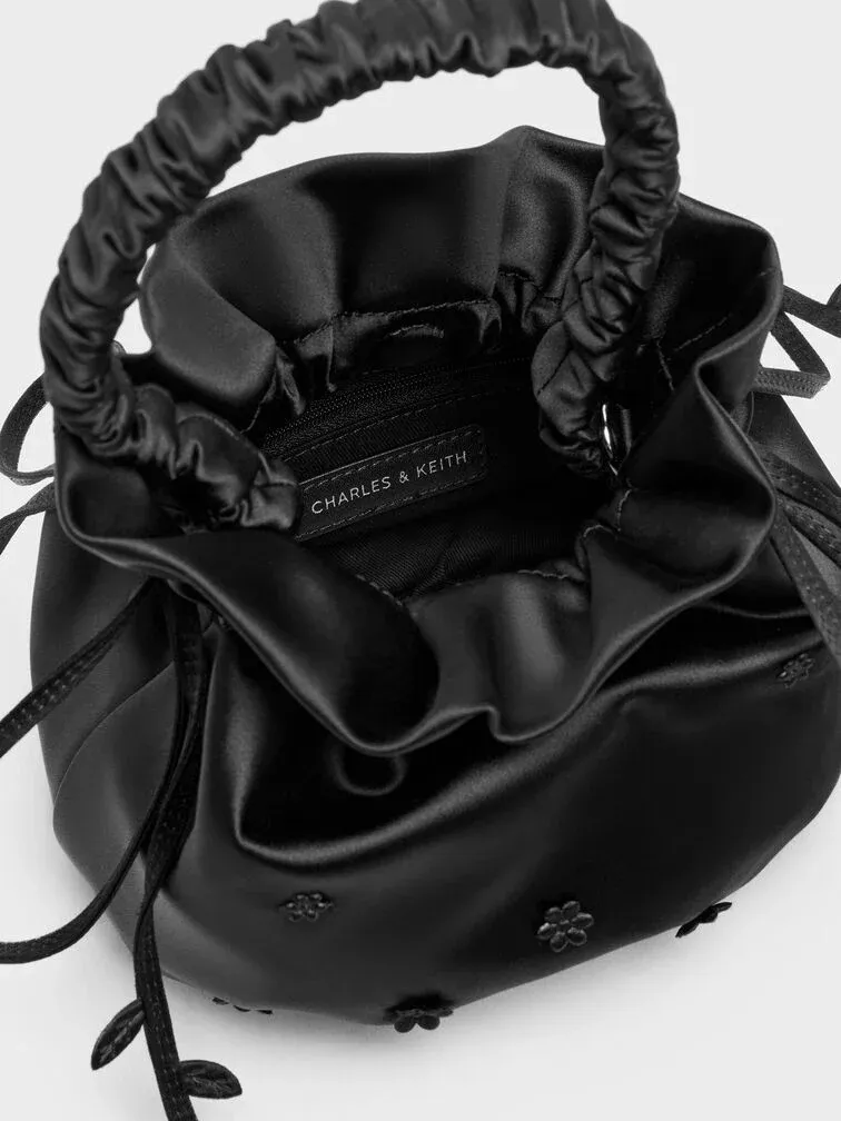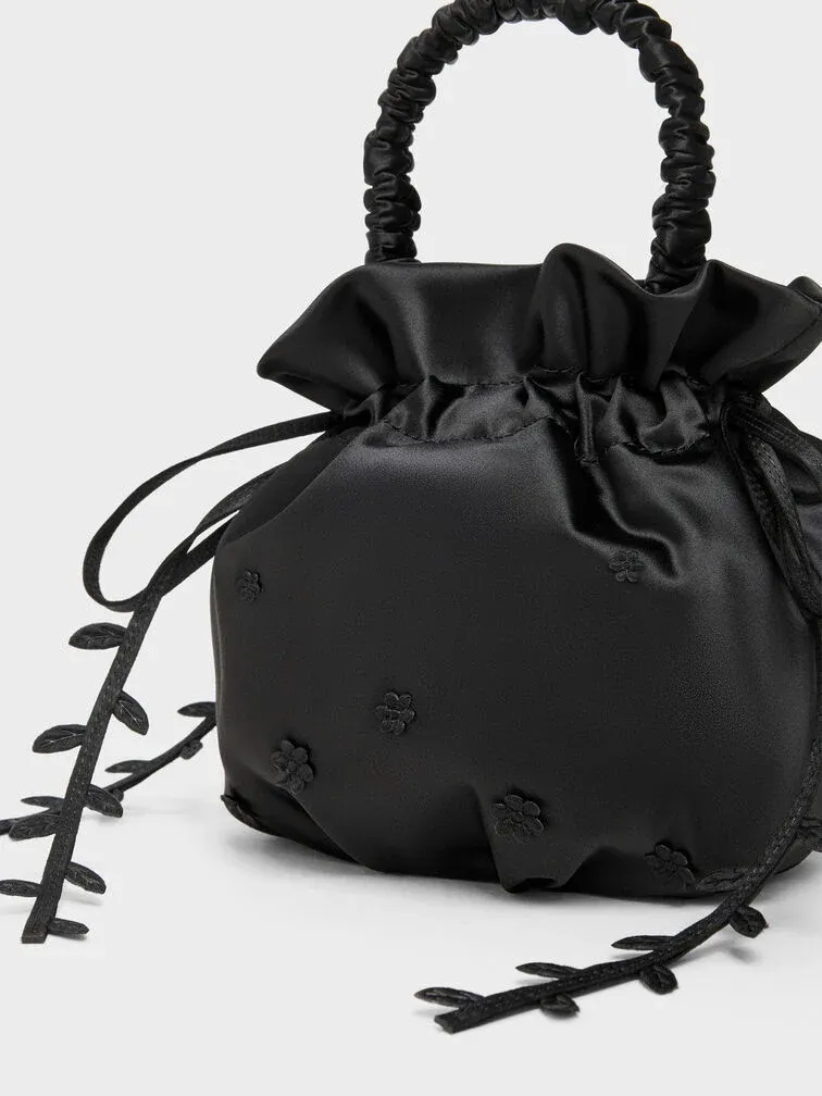 This Mabel bucket bag in black is made with satin and features flower appliques, vine-like straps, a ruched handle, a drawstring closure and a cute dumpling shape. Carry it for lunch time and during the weekends.