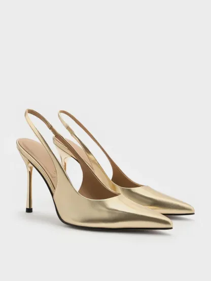 These slingback pumps in gold are made with metallic leather and feature sleek pointed toes and sharp stiletto heels. Pair them with your favourite evening dress for a striking and sophisticated look.