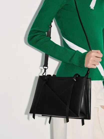 You do not have to sacrifice form for function with this Midori tote. Tasteful details refresh the classic rectangular tote silhouette - geometric folds create swooping, clean lines that tie in perfectly with the sculptural knots on the handles. In a sleek black finish, the bag exudes understated sophistication. Opening up to a roomy interior, it will hold all that you need for the day and more, complete with a secure zip closure. On days when you want to go hands-free, clip on the adjustable strap to carry it on the shoulder. With its nifty versatility, this polished carrier is a great everyday companion.