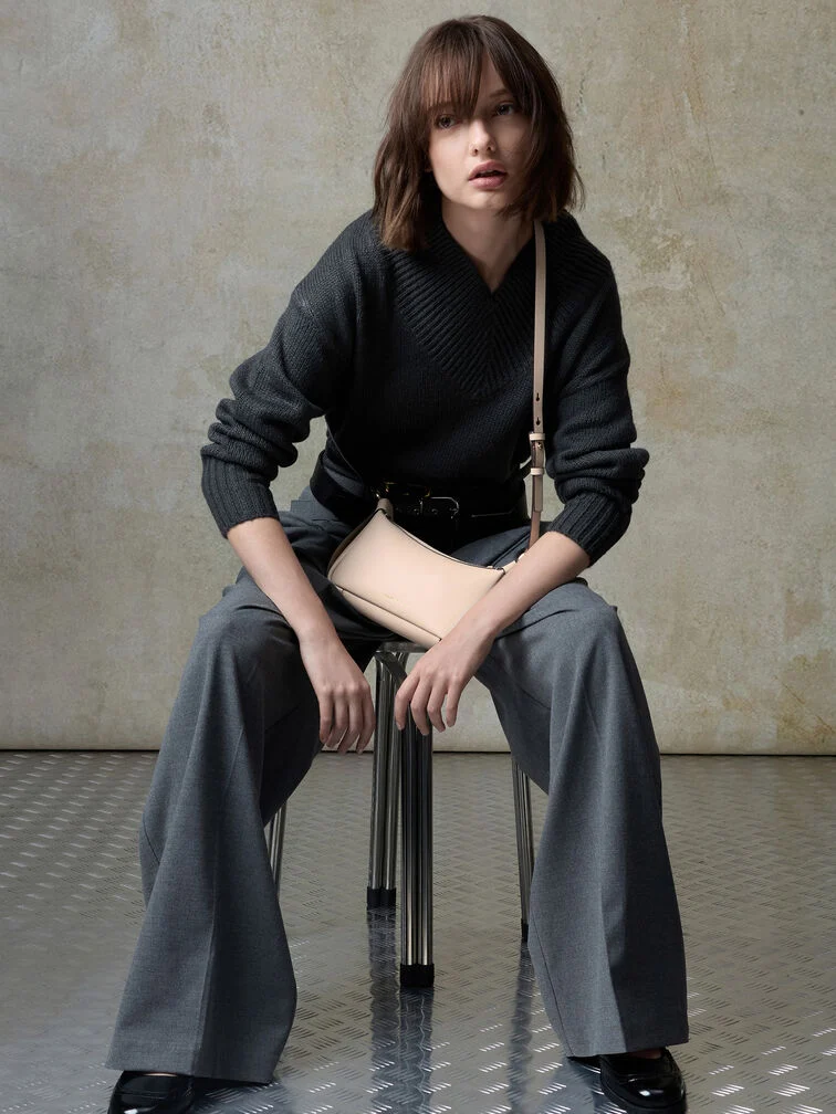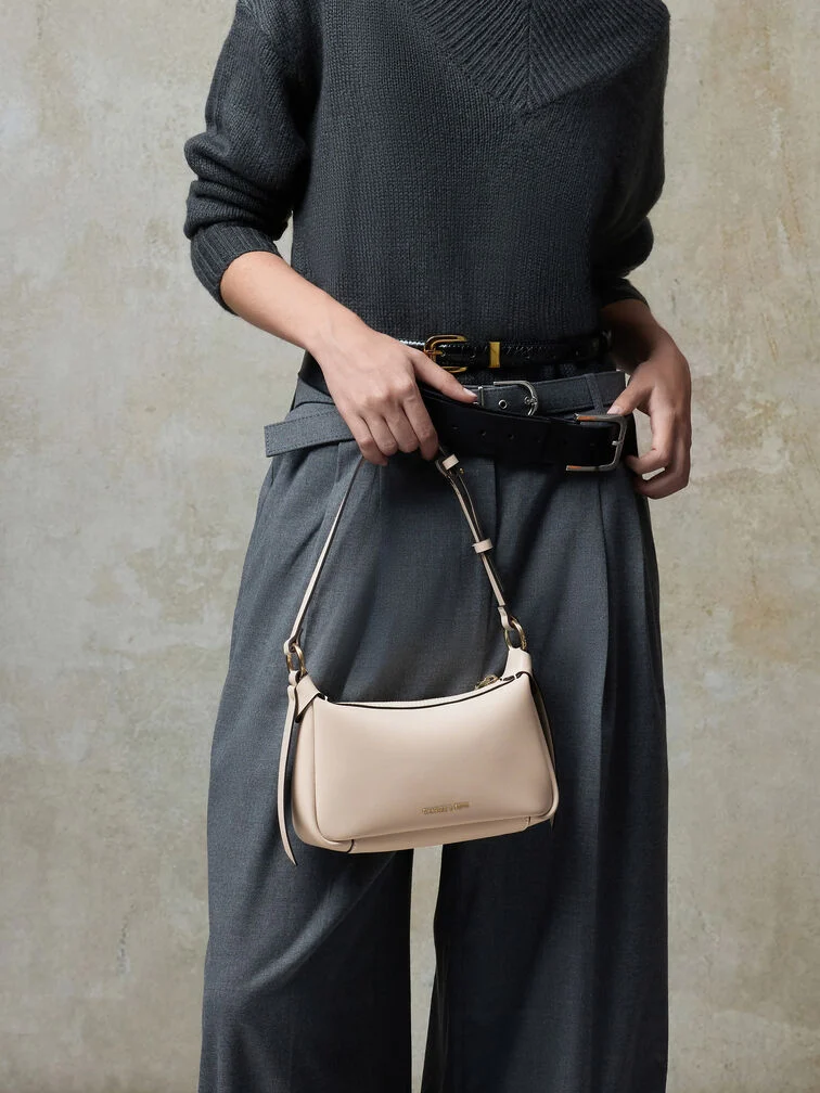 This mini Calla shoulder bag in oat features a compact silhouette and an adjustable strap. Pair them with relaxed tailoring to create a stylish everyday look with minimal effort.