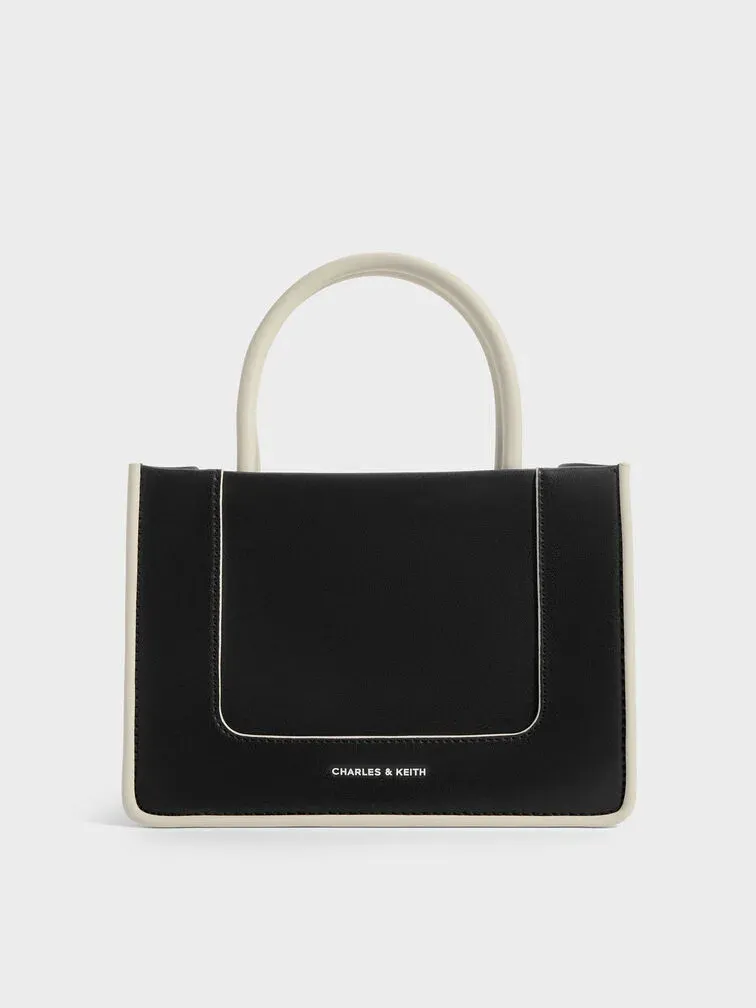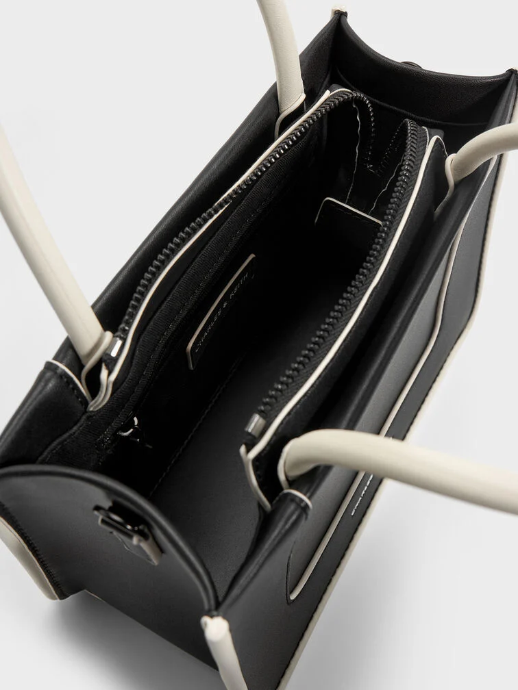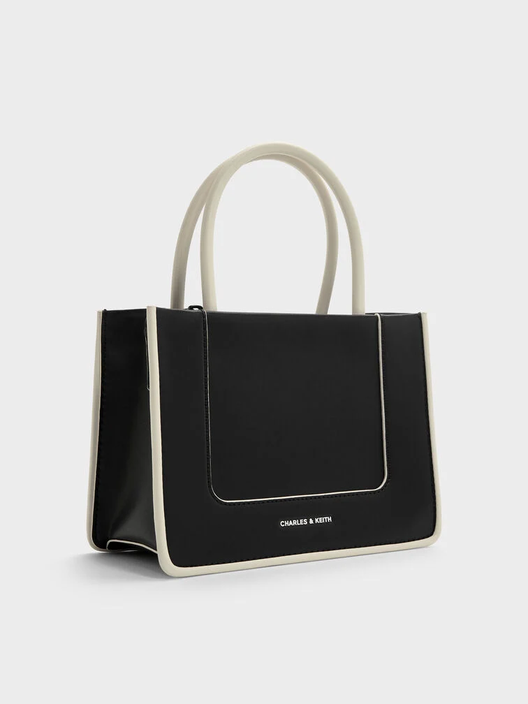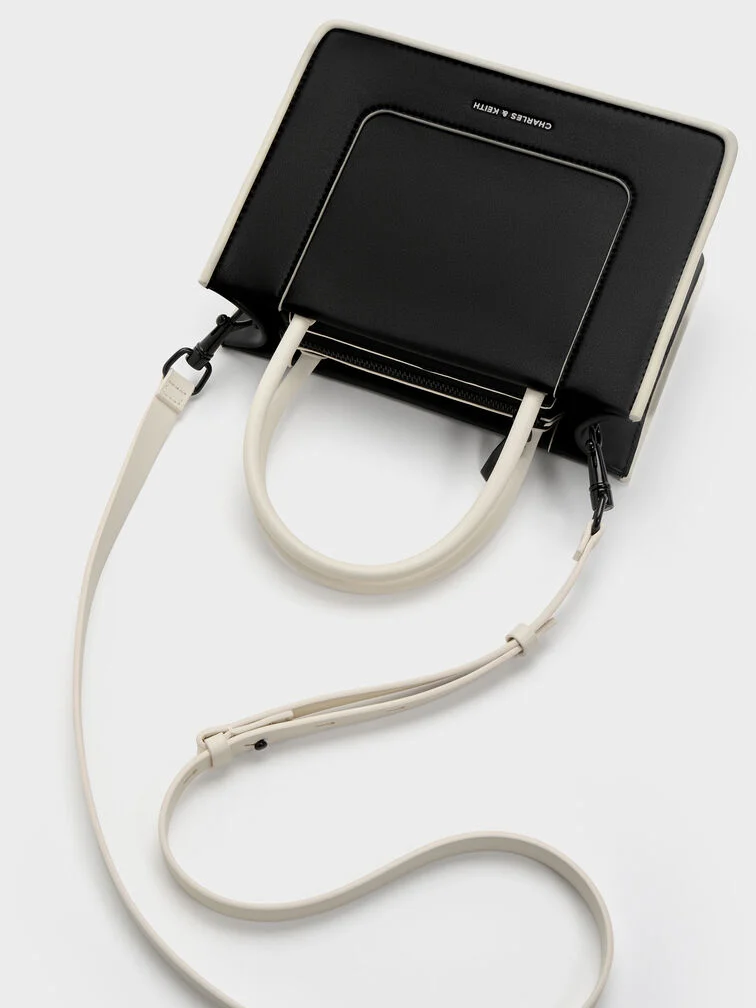 This mini Daylla tote bag has a boxy silhouette and features a black body with white trims and handles. It also comes with a detachable shoulder strap. Use it to balance relaxed tailoring with stylish structure.