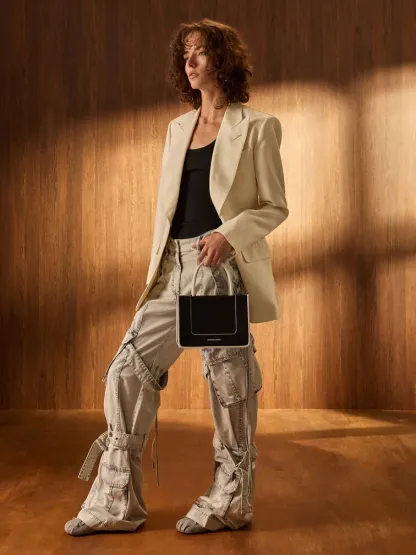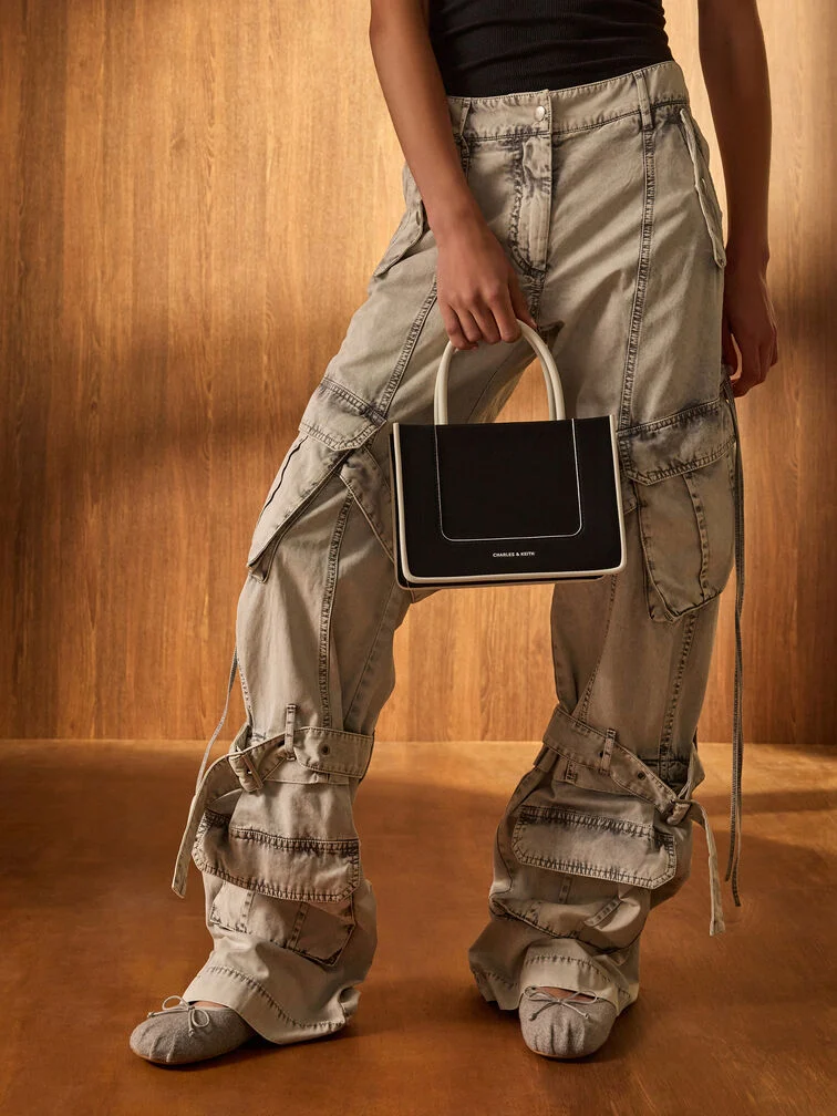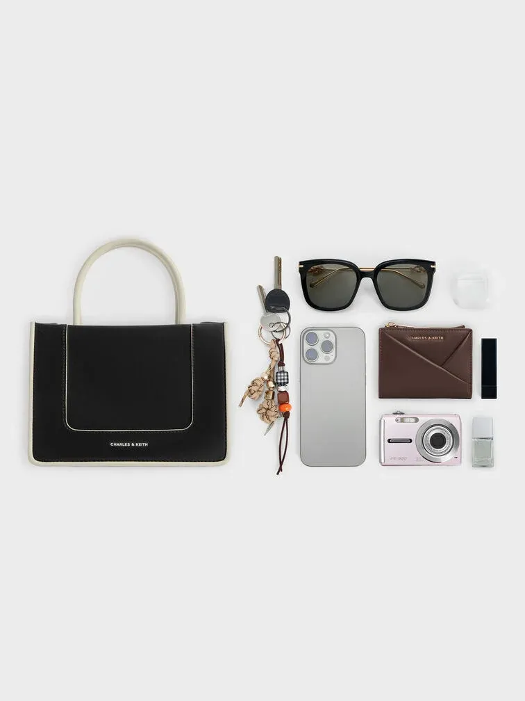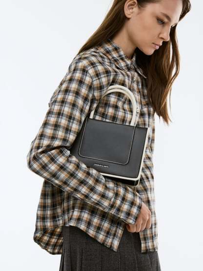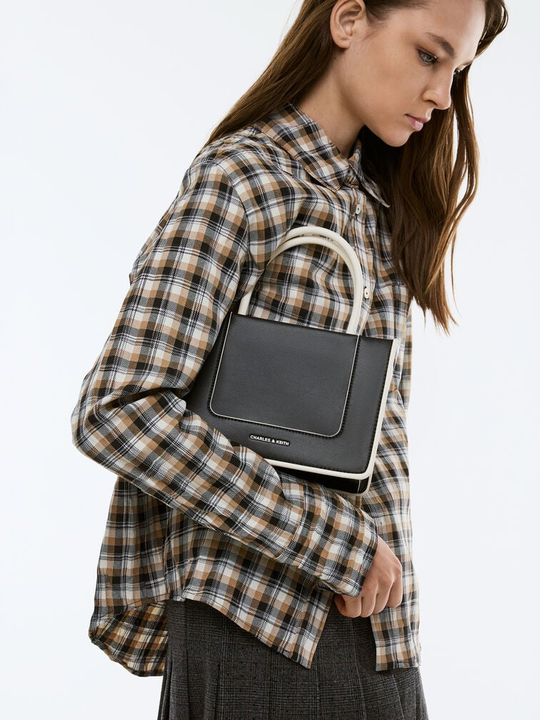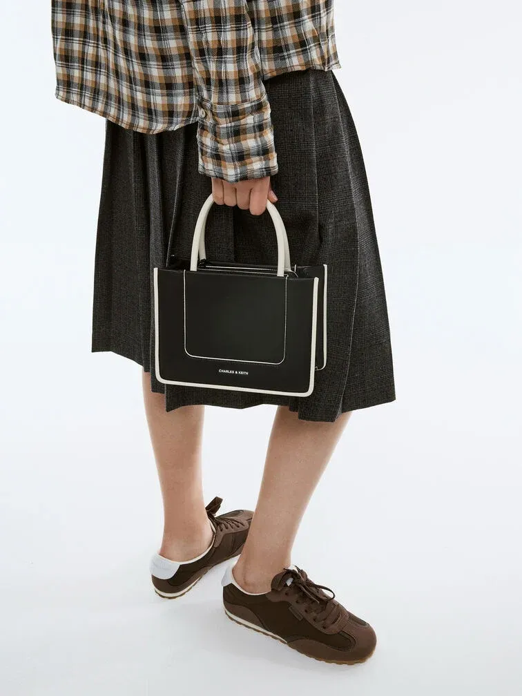 This mini Daylla tote bag has a boxy silhouette and features a black body with white trims and handles. It also comes with a detachable shoulder strap. Use it to balance relaxed tailoring with stylish structure.