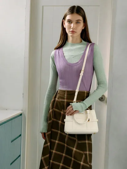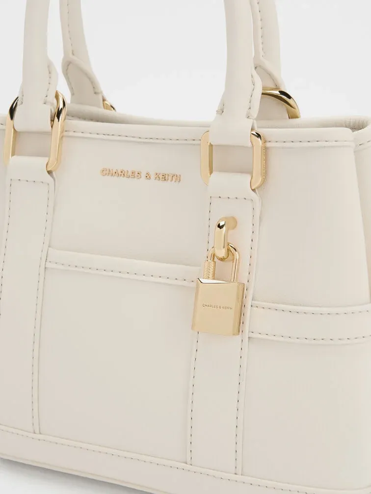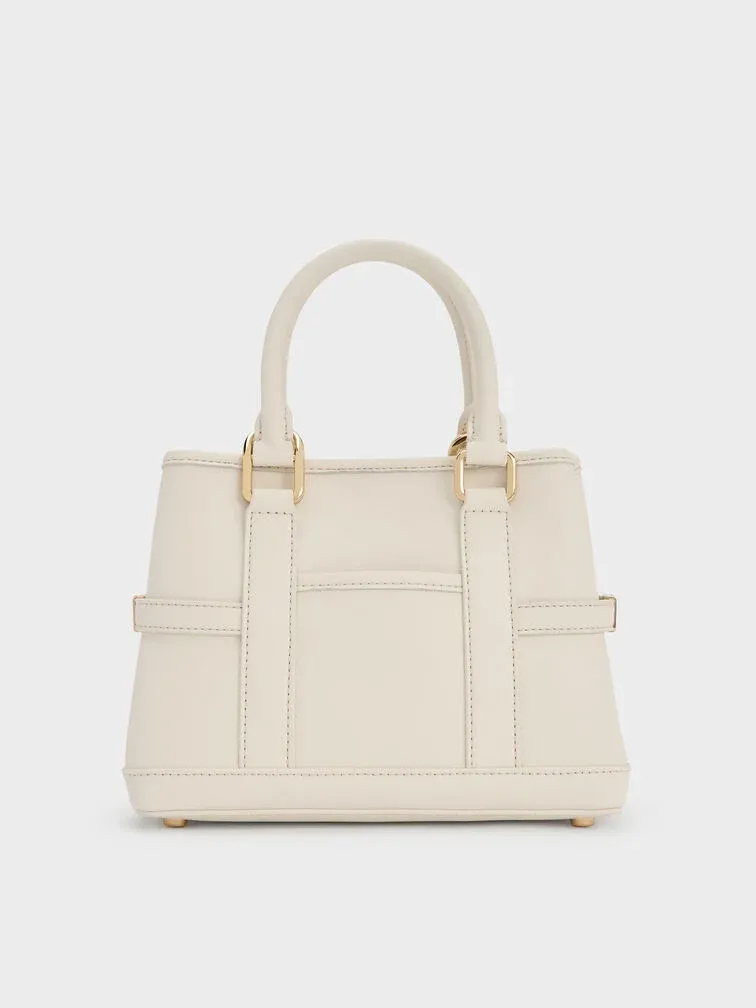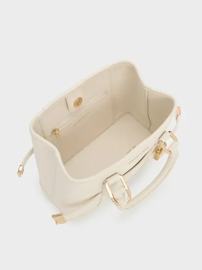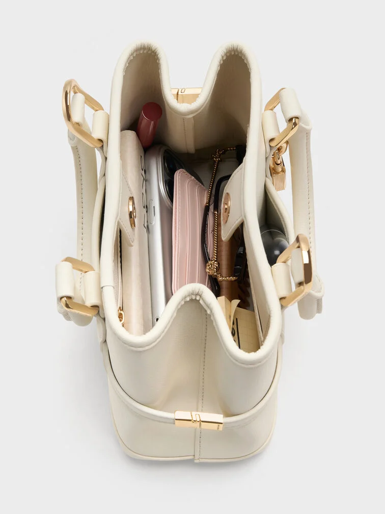 This Scottie tote bag in cream features buckled side straps, a shiny gold-tone lock charm, short double handles, a magnetic closure and a roomy interior. Match it with neutral tones to create a soothing aesthetic that will keep you feeling calm all day.