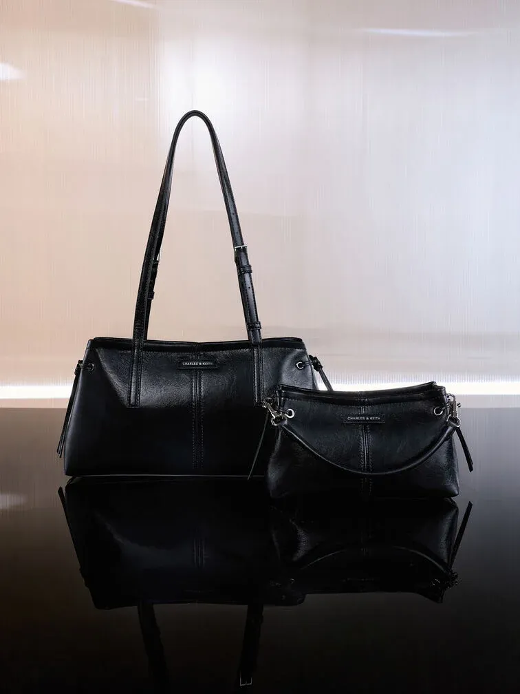 This shoulder bag exudes elegance in its simplicity. The wrinkled PU finish adds a subtle edge, while the elongated handles offer ease of wear. With its classic black hue and minimalist design, it is a versatile piece that will pair effortlessly with any outfit.