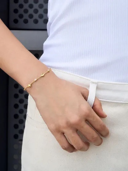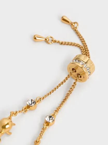 With fond memories of summers often made by the beach, this bracelet draws inspiration from the sea. Adorned with ocean-inspired charms such as seashells and starfish, sparkling crystal gems add touches of twinkle in between. Featuring a convenient drawstring fastening, the width of the bracelet can be easily adjusted for effortless yet secure wear. The gold-toned finish lends a touch of glamour and elegance to any outfit.