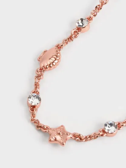 The rose gold iteration of the Oceana crystal bracelet offers an understated alternative to its gold counterpart, ideal for everyday wear. Mirroring the design of the gold version, it boasts ocean-themed charms such as seashells and starfish, accented by sparkling crystal gems. Equipped with a drawstring fastening, the width of the bracelet can be effortlessly adjusted for easy yet secure wear.