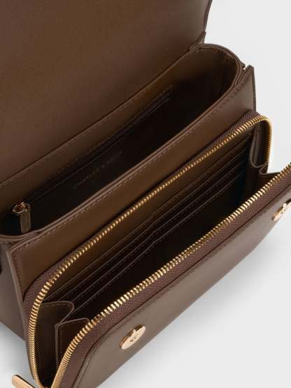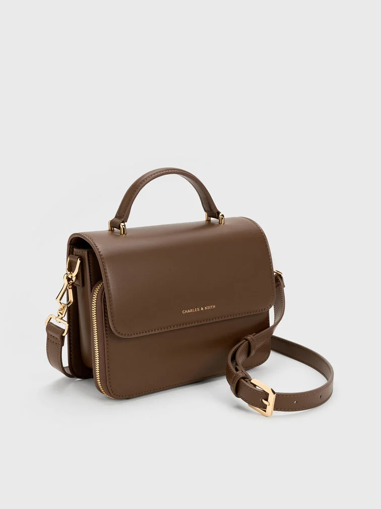 For a simple yet elegant carrier, look no further than this Octavia front flap bag. The luxurious dark brown finish lends an air of sophistication to the minimal exterior, creating a polished silhouette that is tastefully adorned with gold-toned hardware. As a subtle detail, the CHARLES & KEITH logo is etched on the front flap. Equipped with a sturdy top handle and detachable shoulder strap, let this bag elevate your outfits no matter how you carry it.
