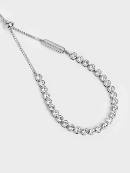 This Paige tennis bracelet features round clear crystals, an adjustable slider clasp for a perfect fit and extra crystals on either end of the silver-tone chain. With a tonal finish, this bracelet can be easily mixed and matched with other pieces in your collection.