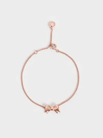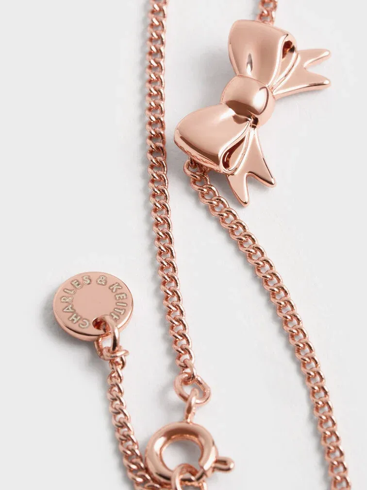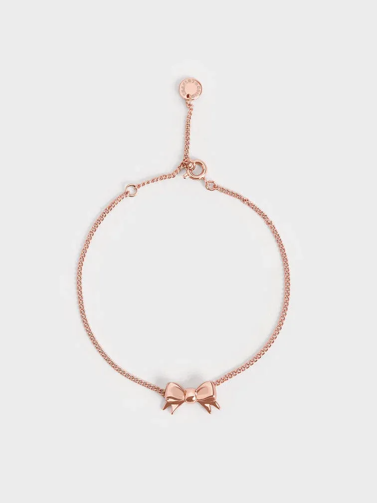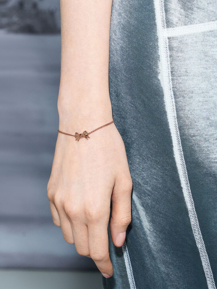 The Paige bracelet features a delicate chain supporting a dainty ribbon charm. This rose gold version leans into the feminine aesthetic, ideal for those who want to embrace the coquette trend in an understated manner. Wear yours layered with other rose gold designs for a stylishly stacked look. Alternatively, consider it as a failproof birthday or anniversary gift for your loved ones.