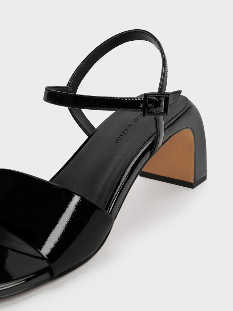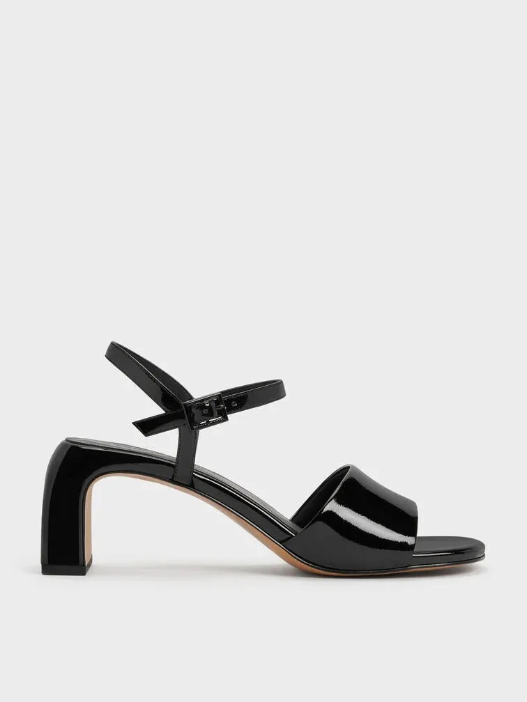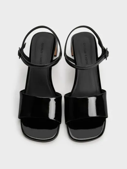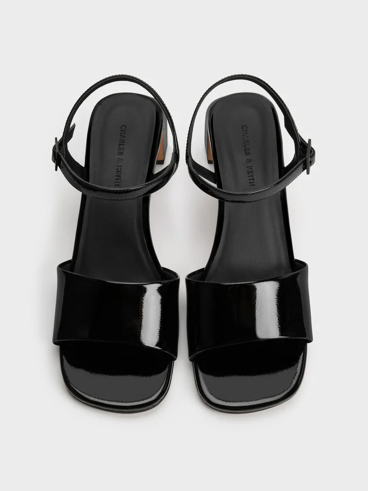 These sandals in black feature a patent finish, thin ankle straps, open square toes, and chunky blade heels. Use them to enhance weekday sartorial combinations with their sleek, minimalist design.
