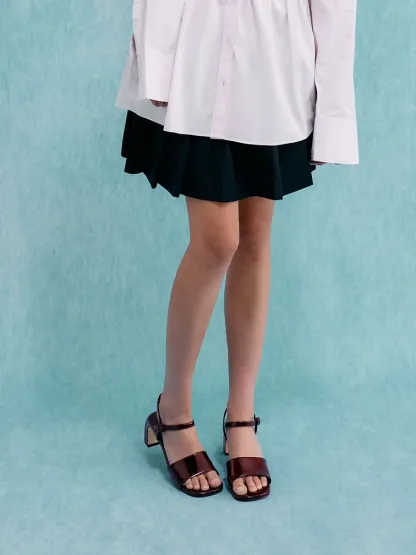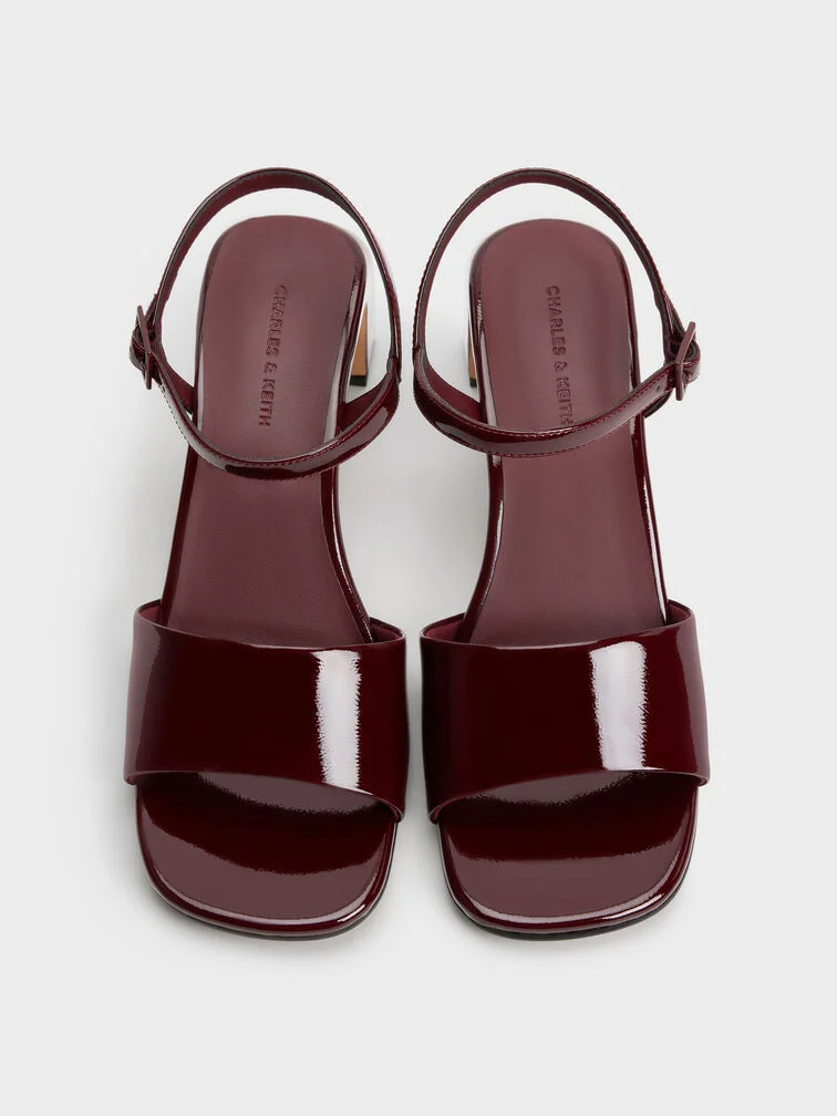 These sandals in burgundy feature a patent finish, thin ankle straps, open square toes, and chunky blade heels. Use them to introduce a touch of luxurious colour to relaxed weekend ensembles.