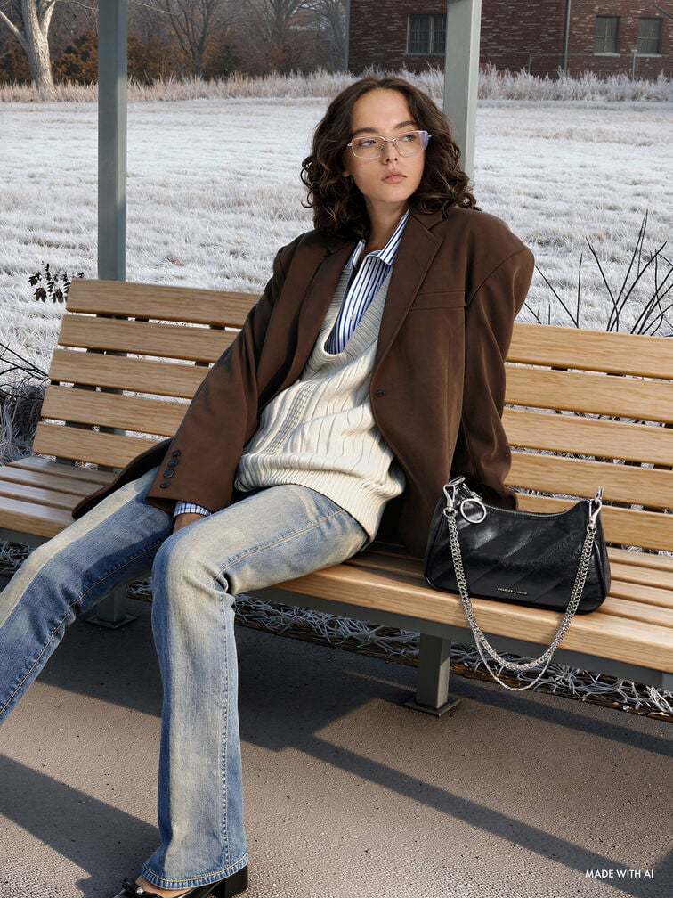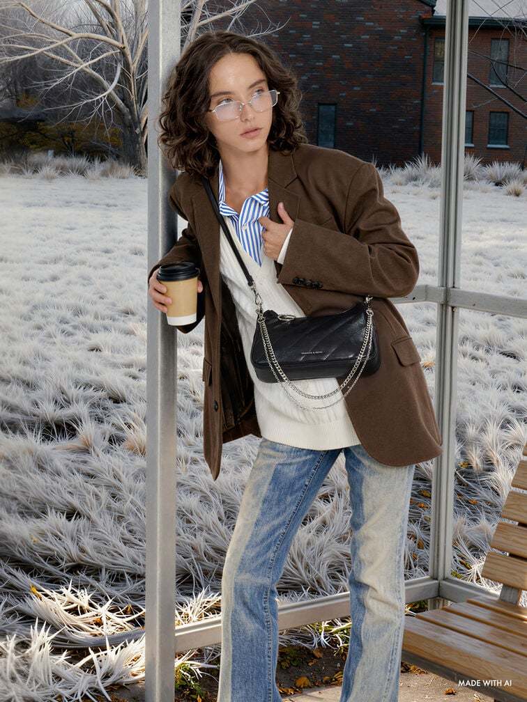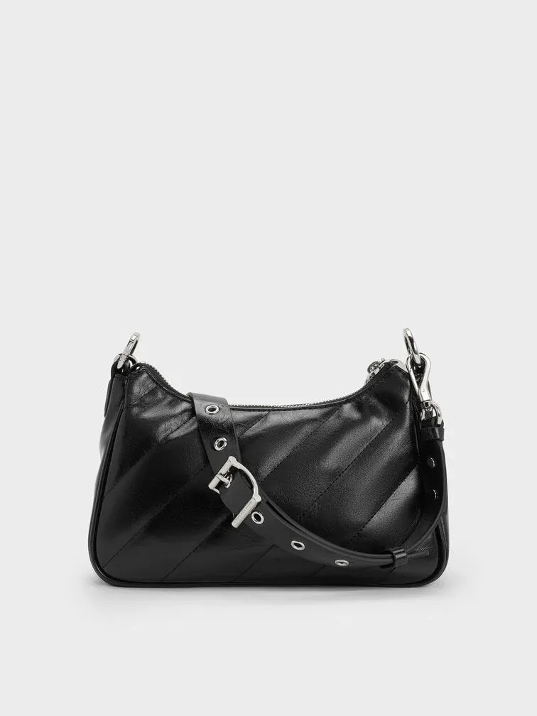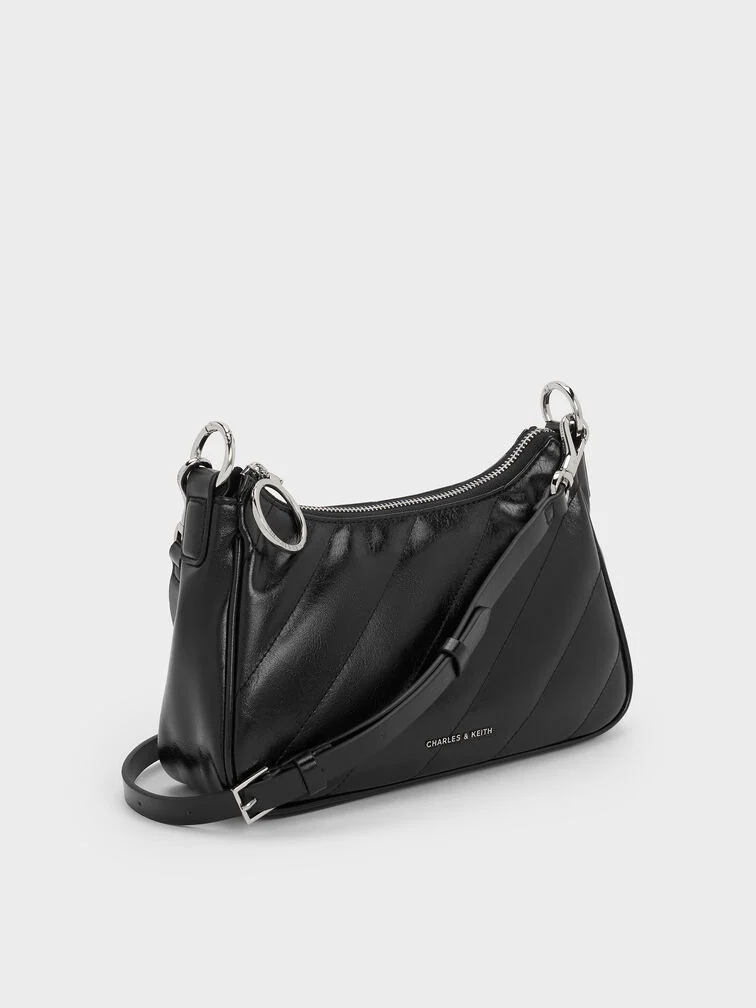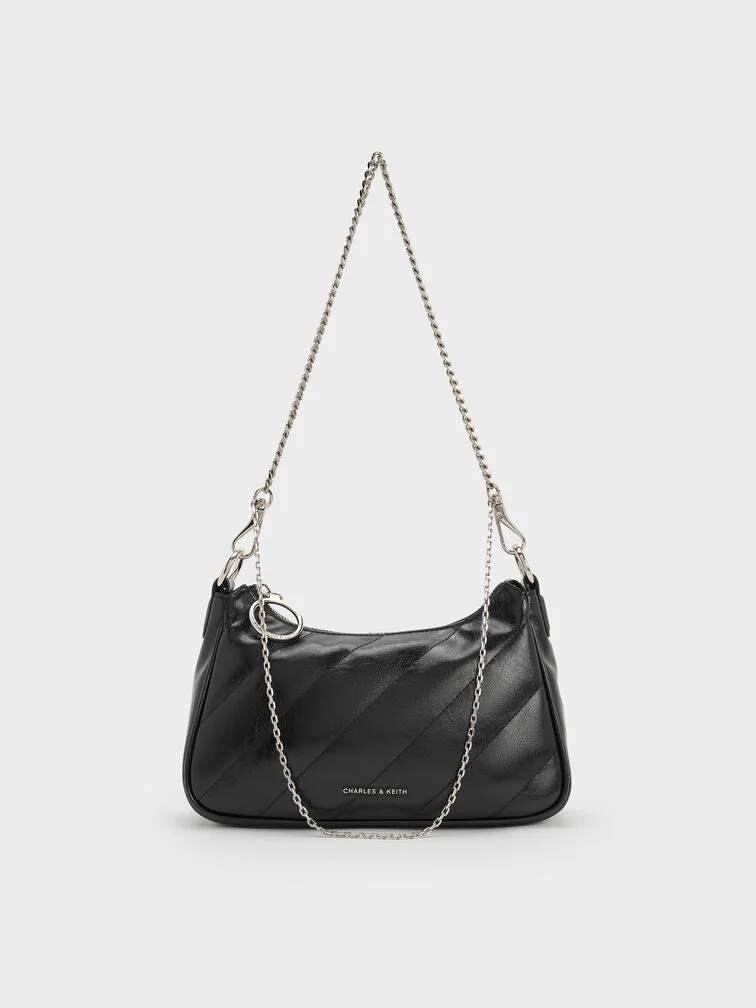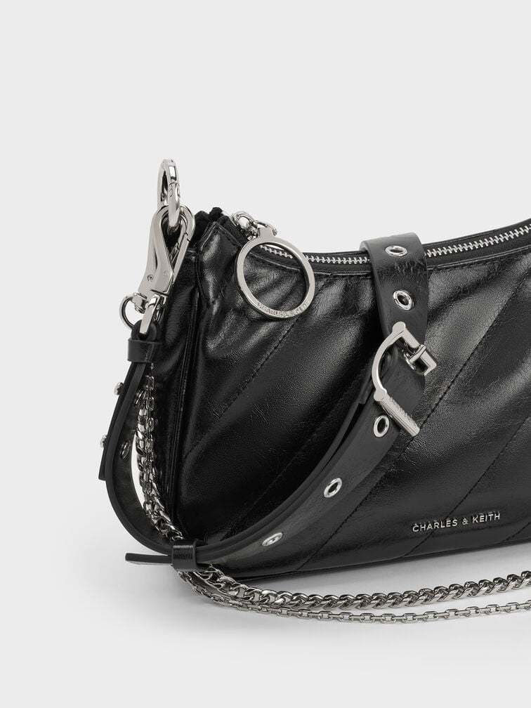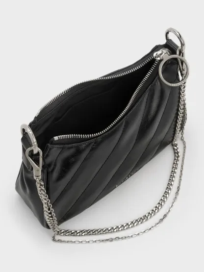 This Philomena crossbody bag in black features a crinkle-effect finish, a trapeze silhouette, an edgy double-chain strap and a detachable shoulder strap. Pair it with monochromatic looks for a polished everyday aesthetic.