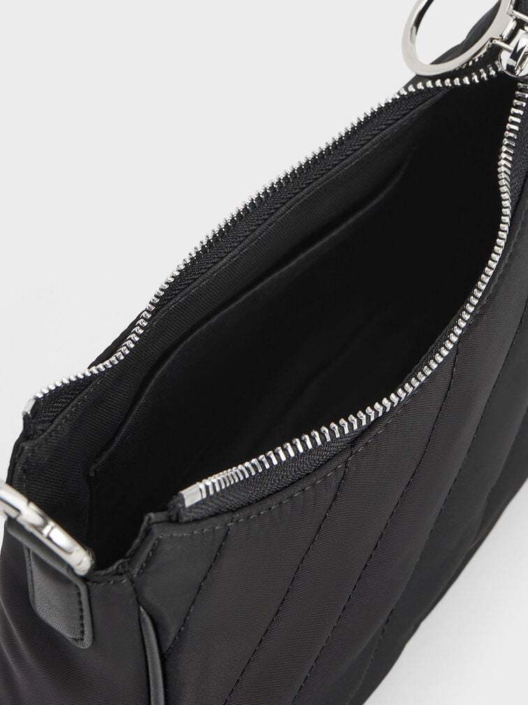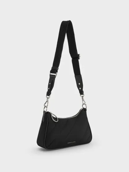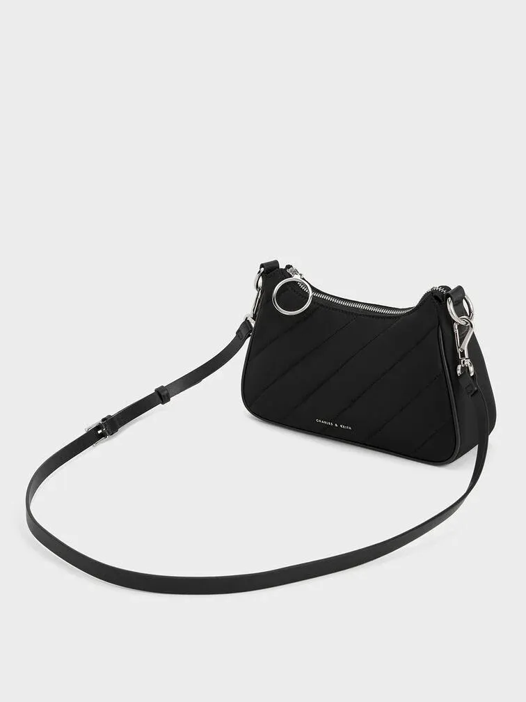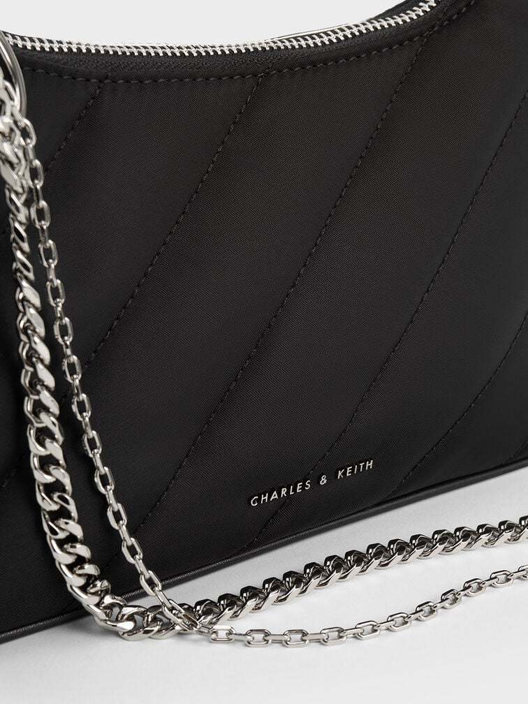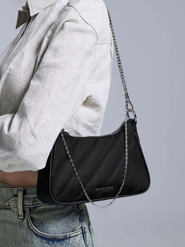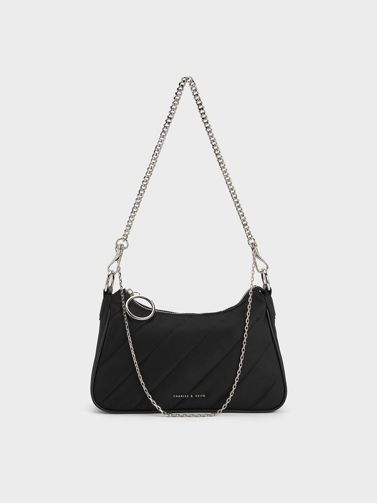 This nylon crossbody bag combines style with practicality. It proudly boasts the dangling chain strap detail and slanted panel quilt pattern that makes the Philomena distinctive. The silver hardware adds an element of understated elegance to the overall design. Rest assured, you will not have to stress about coordinating your outfit because this bag effortlessly complements anything you wear. Featuring both chain and PU straps, you can easily switch up your style whenever the mood strikes.
