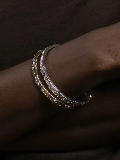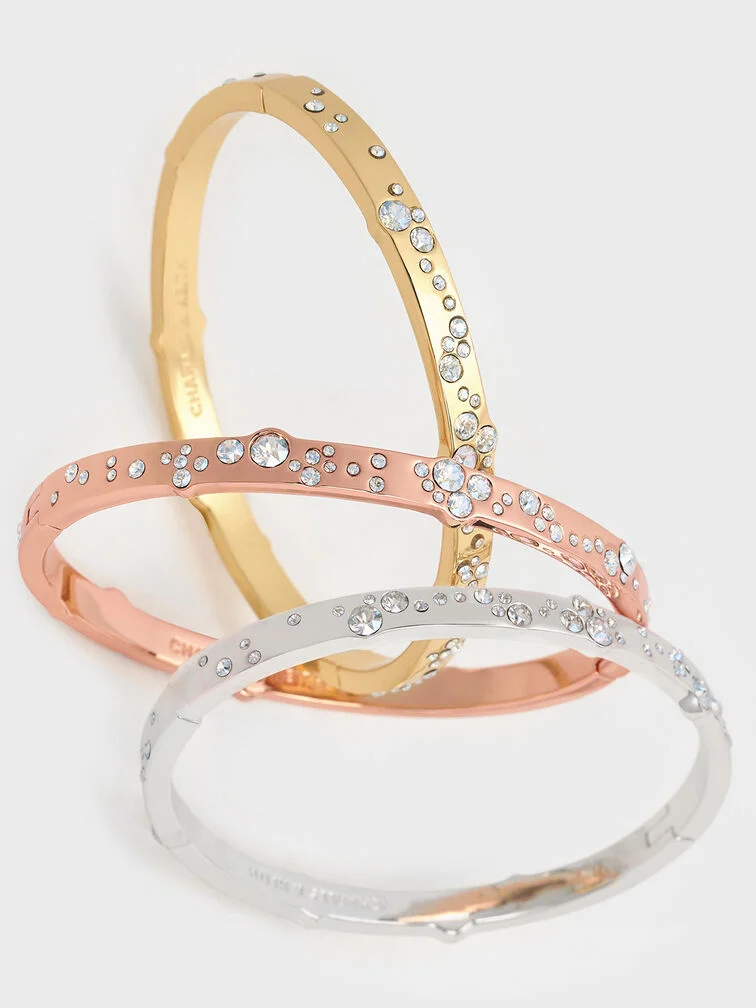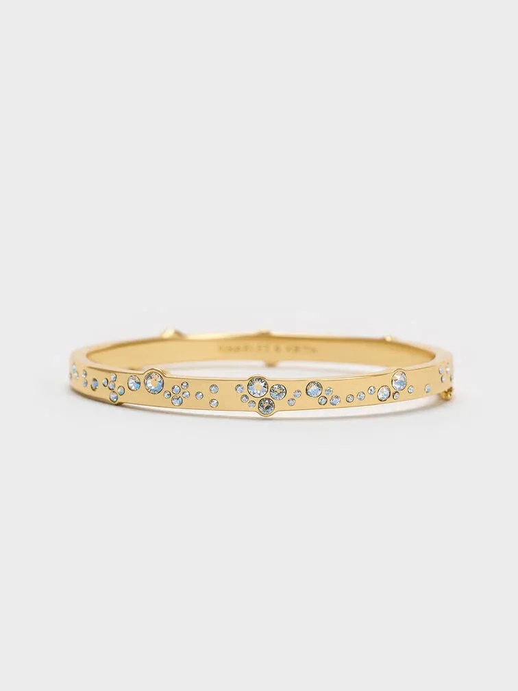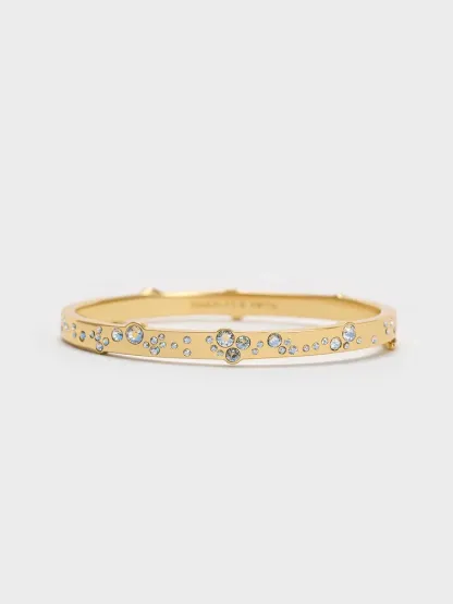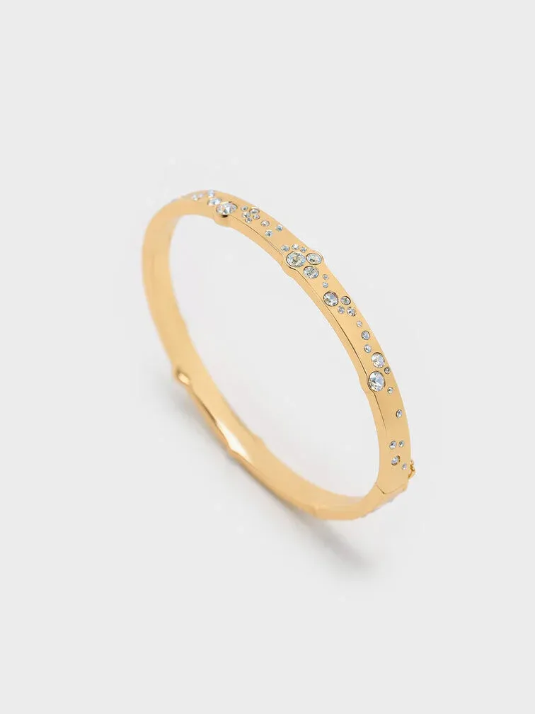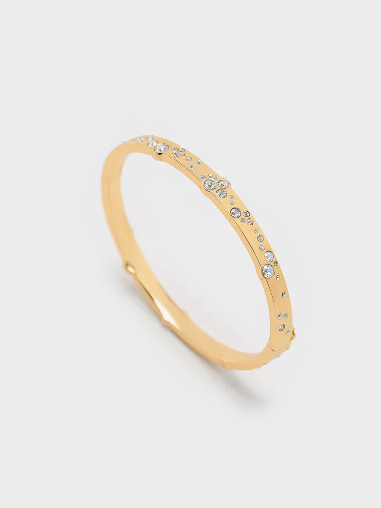 The Reverie jewellery collection is distinguished by crystal balls that embellish each piece. These crystal balls come in varying sizes and feature a purposefully non-uniform design, adding dimension to the overall look. This yellow gold bangle will provide the perfect finishing touch to any outfit and can be stacked with other minimalist designs for a personalised touch. It will add extra sparkle to your everyday wardrobe and a hint of glamour to your routine.
