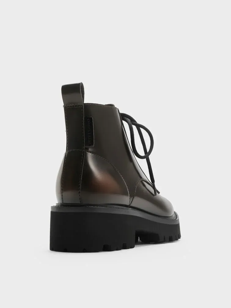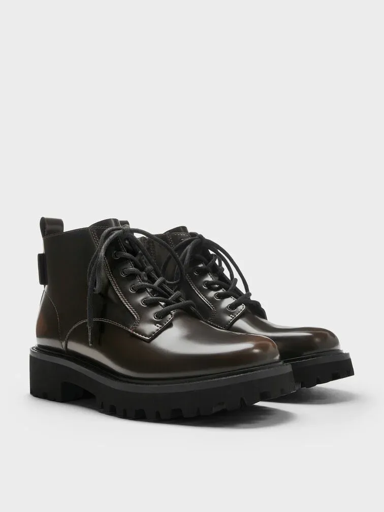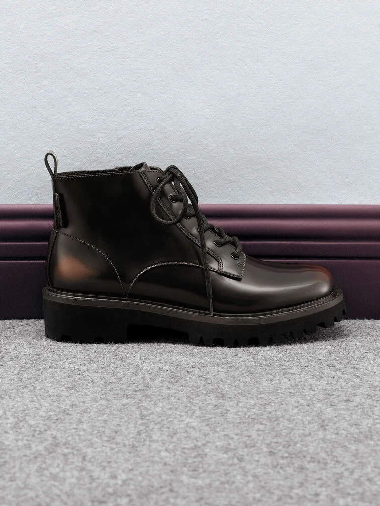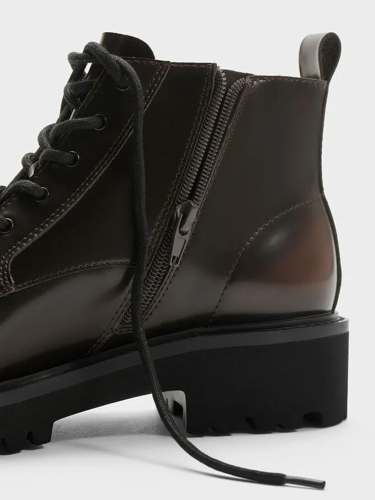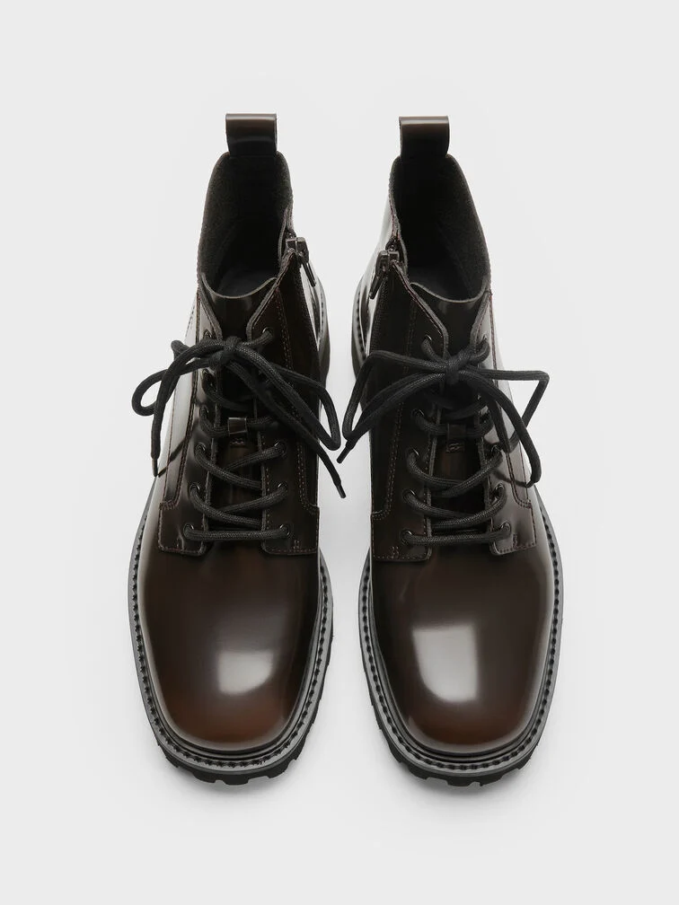 These combat boots in glossy dark brown feature classic lace-up closures with convenient side zips for ease of wear. Use them to add an edgy touch to relaxed tailoring, creating a day-to-evening outfit that’s quietly self-assured.