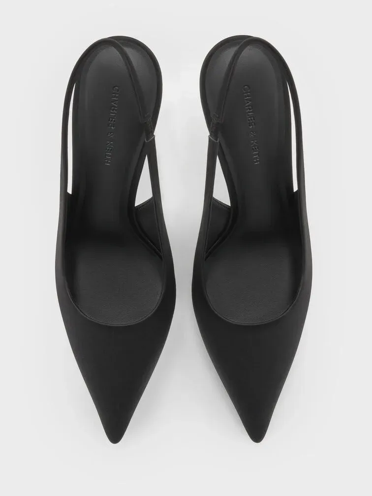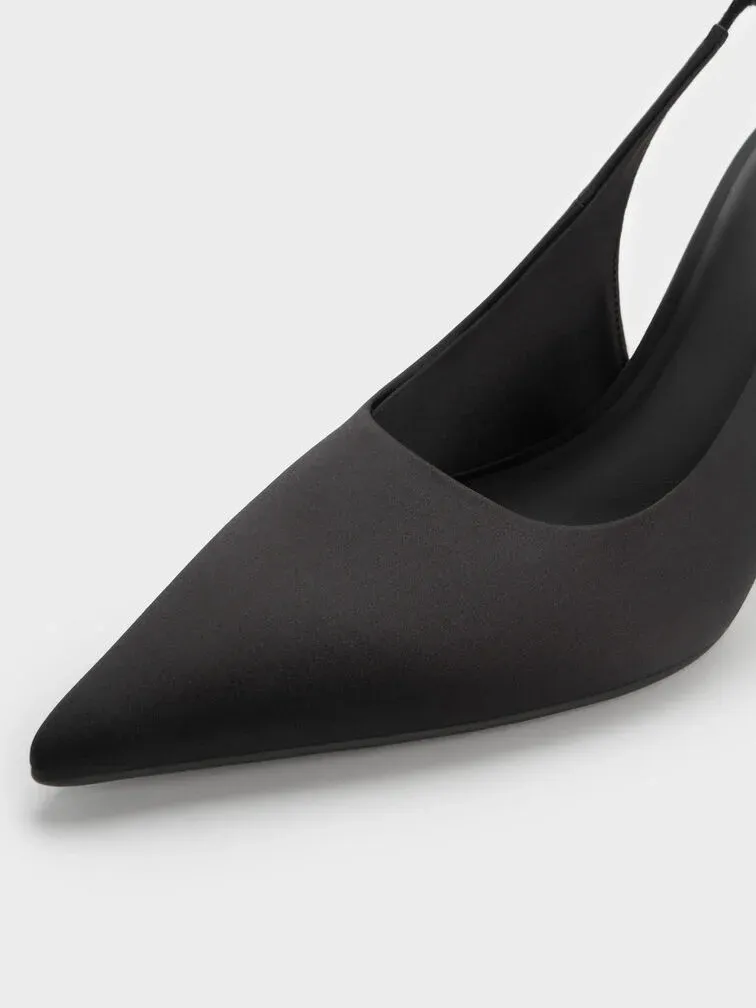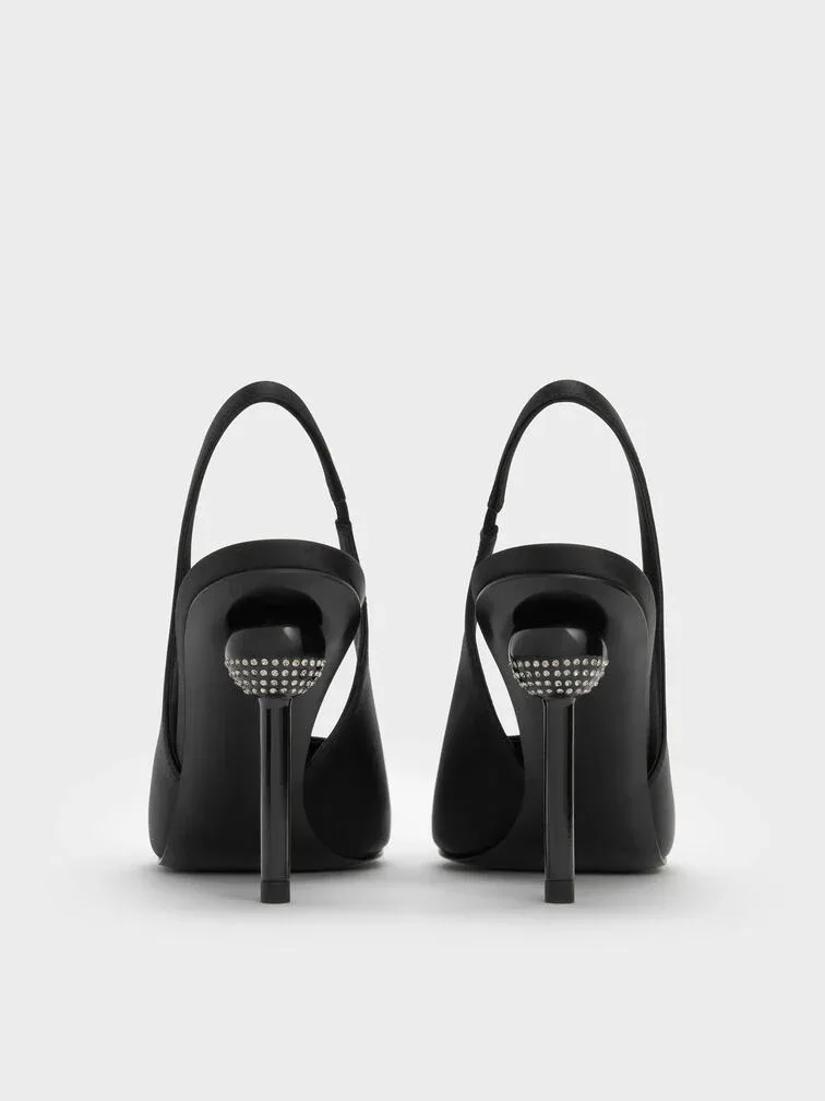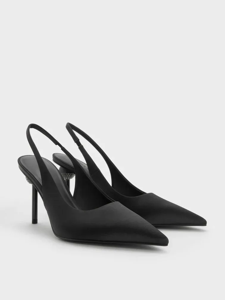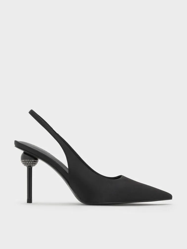Satin Crystal Ball-Heel Slingback Pumps - black textured