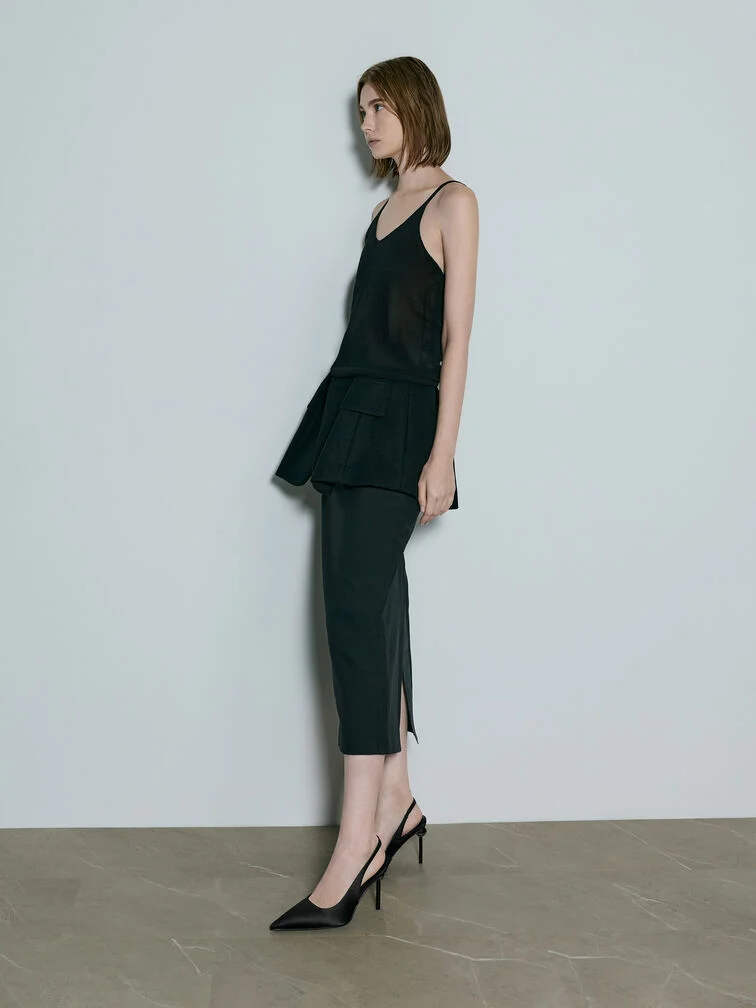 These slingback pumps in black are made with satin and feature pointed toes and crystal embellishments on their sculptural ball heels. Let them anchor after-dark ensembles with their classic design and subtle shine.