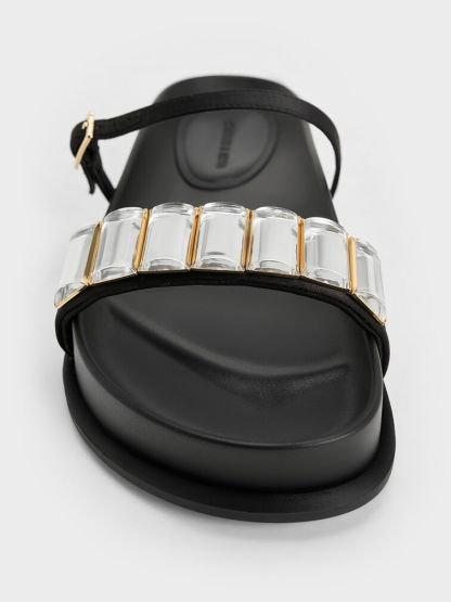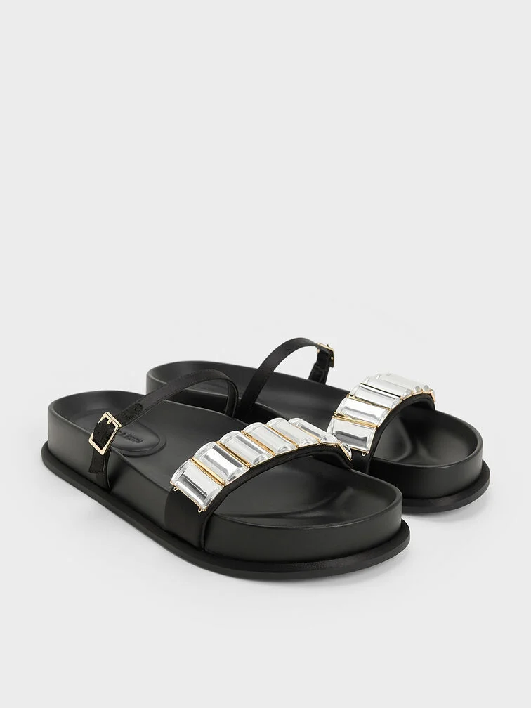 Satin Crystal-Embellished Double-Strap Sandals - black textured