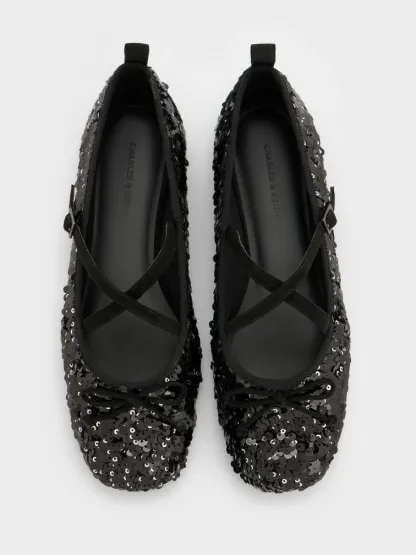 Sequinned Crossover Mary Jane Flats - black textured