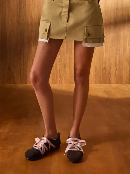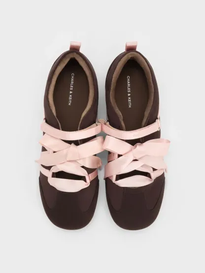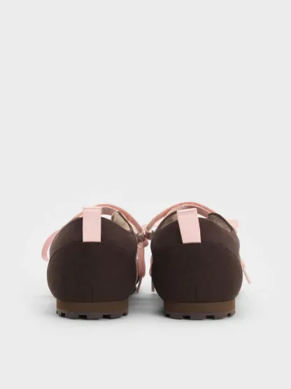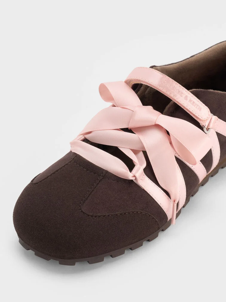 These Silko ballet sneakers in dark brown are made with faux suede and feature pink satin laces, ridged soles and rounded toes. Wear them with your favourite casual separates for playful femininity and all-day comfort.