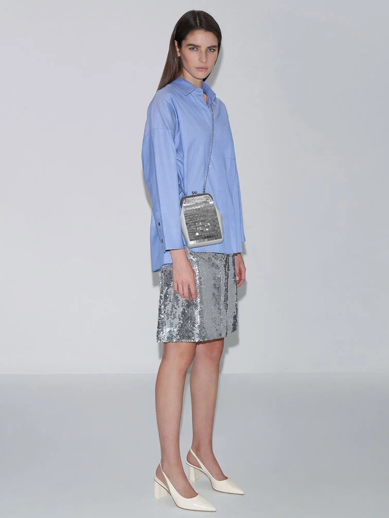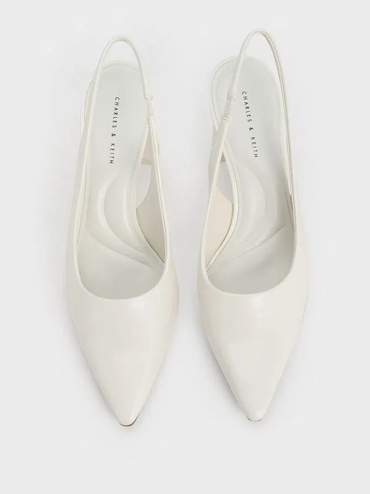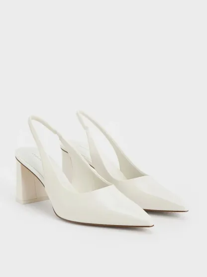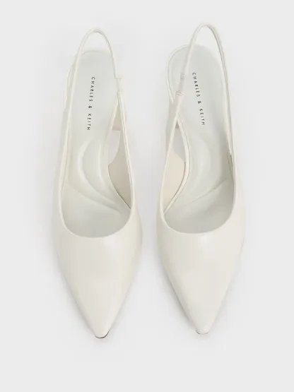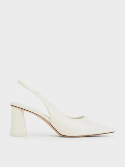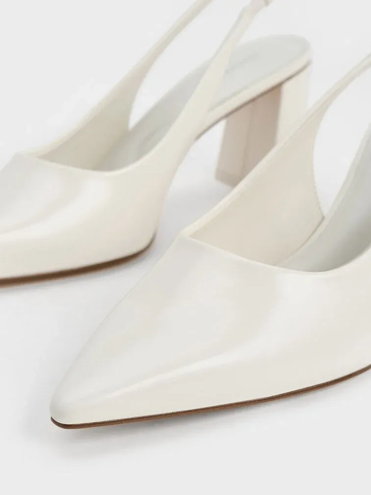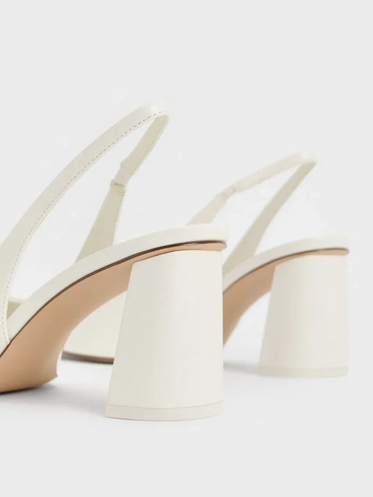 Presenting slingback pumps in match-all white. These gems are set to be a closet staple as they will complement your workwear ensembles with remarkable ease. Set on trapeze block heels, they strike the balance between form and function. Plus, the sharp pointed toes offer a leg-lengthening effect. The lightly elasticated slingback straps guarantee a snug fit.