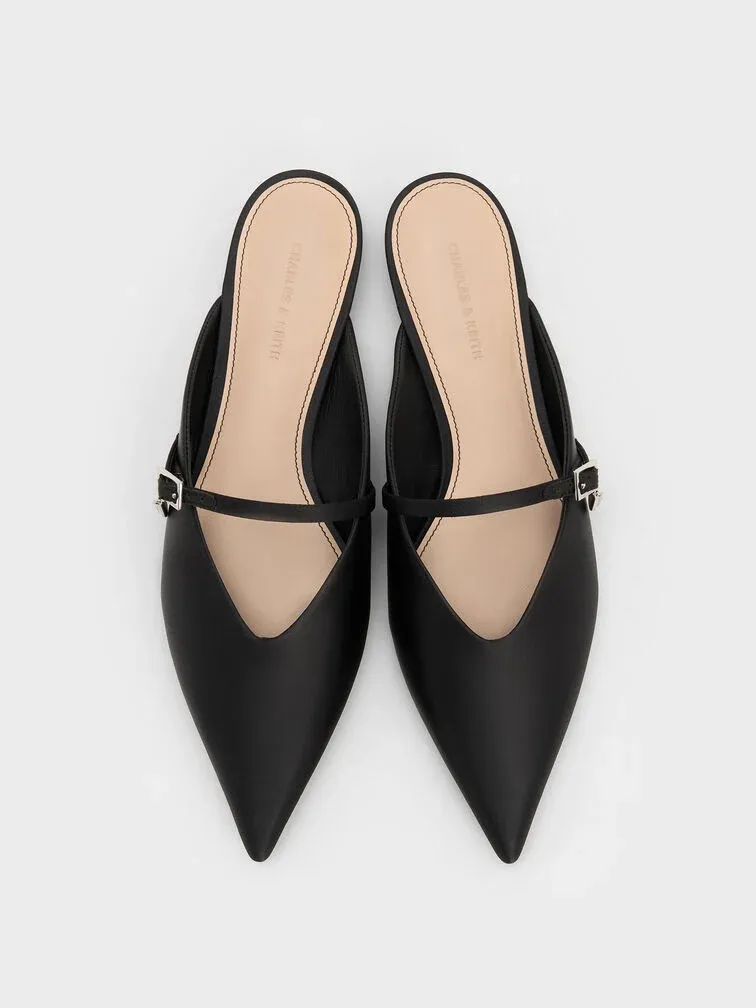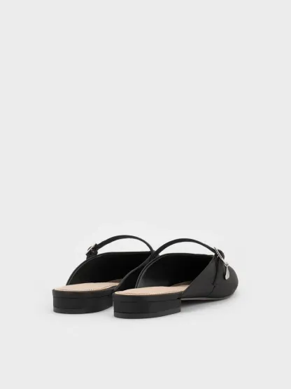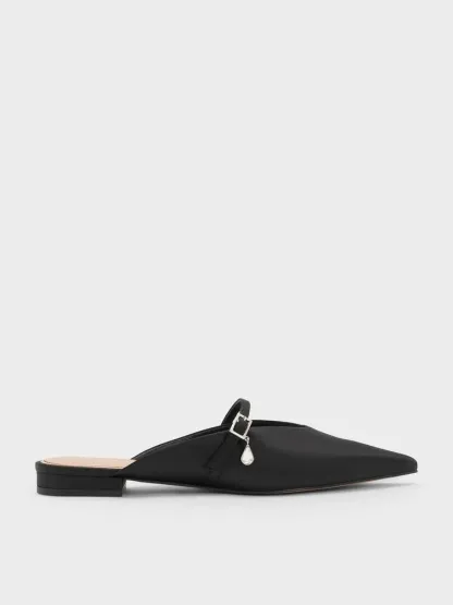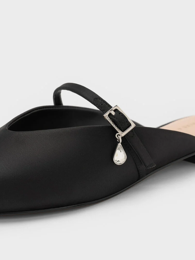 These flat mules in black are made with satin and feature dangling teardrop crystals, slim buckled straps and pointed toes. Wear them with tailored shorts for a simple yet refined look that is well-suited for casual daytime gatherings.