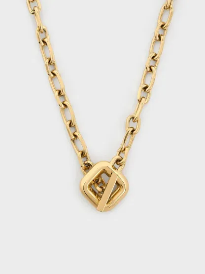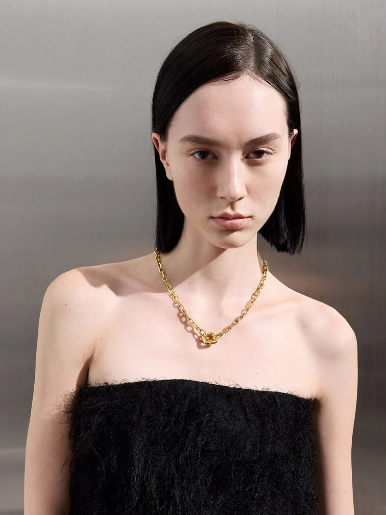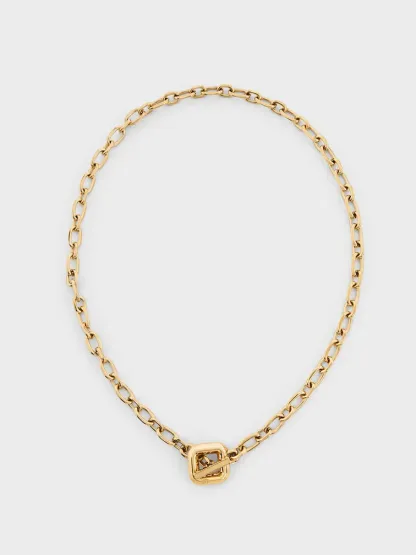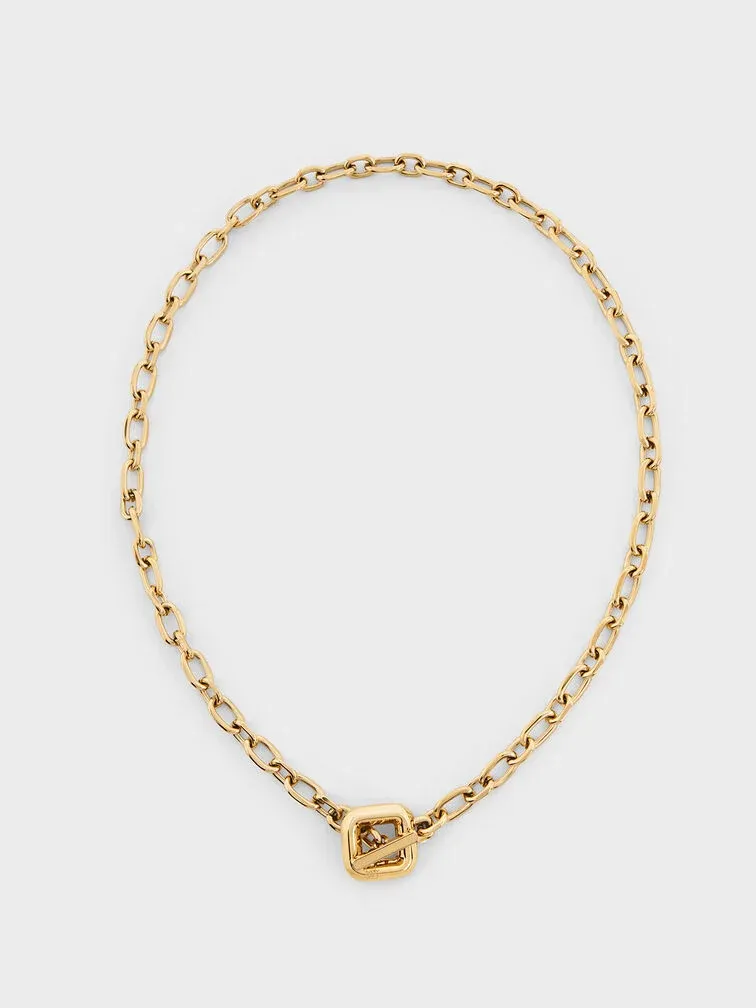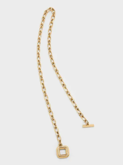 Looking for a statement piece to add to your jewellery collection? Look no further than this chain necklace. Made with gold-tone stainless steel, this piece features interlocking chain links with a square toggle clasp right at the centre as its pendant. There is a subtle play on proportions, as well as pleasing symmetry. The toggle clasp feature also makes this so easy to put on and take off.