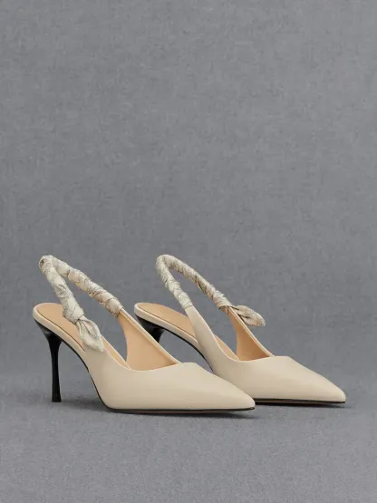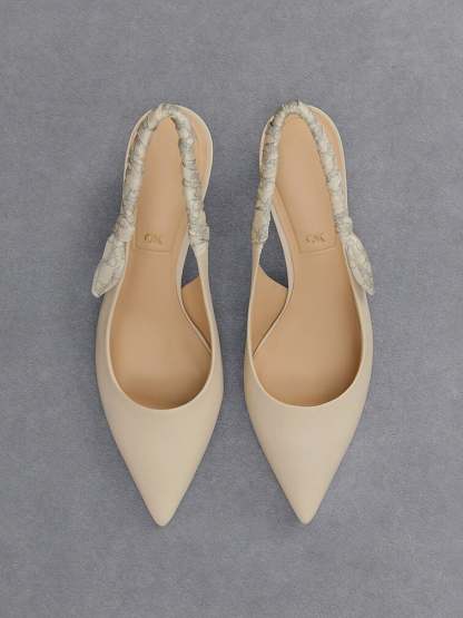In a soft shade of chalk white, these slingback pumps exude understated elegance. They feature ruched slingback straps adorned with a monogram print, adding an interesting detail to the otherwise minimalist design. Set on 8cm stiletto heels, they promise an extravagant style and height boost for all kinds of occasions, from work meetings to dinner dates. Embrace effortless elegance with this pair as they are versatile enough to complement any ensemble.