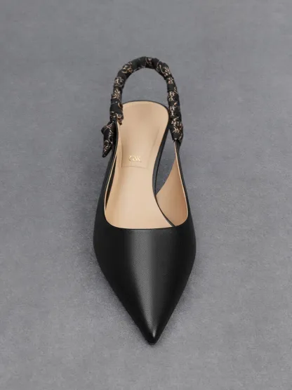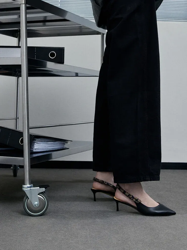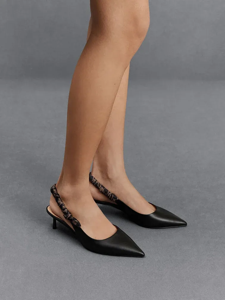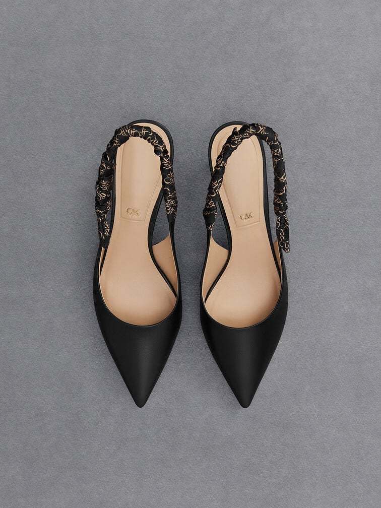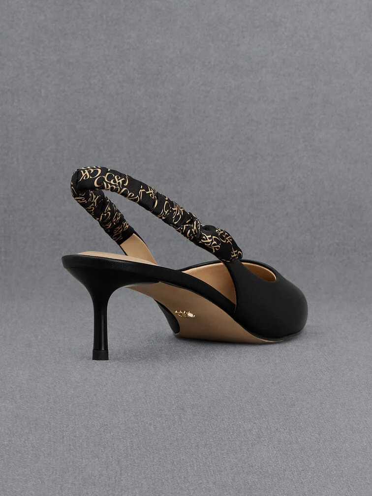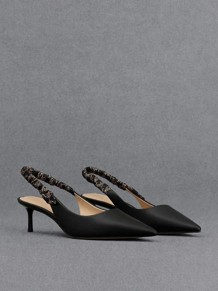 A dressier twist on the classic slingback pumps, this iteration will infuse stylish flair into your outfits. The sleek pointed-toed silhouette is elegant in black, and is versatile enough to match most outfits. As a visually interesting detail, the ruched slingback straps feature the brand’s distinctive monogram print. Set on slender stiletto heels that will elevate your frame, let these pumps spruce up your looks any day of the week.