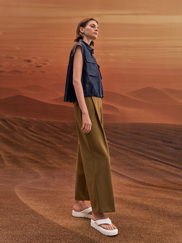 Brighten up your springtime ensembles with these thong sandals. The clean white finish will brighten up any ensemble instantly. Set on flatform soles, they will give you a flattering height boost while being comfortable enough to wear all day.