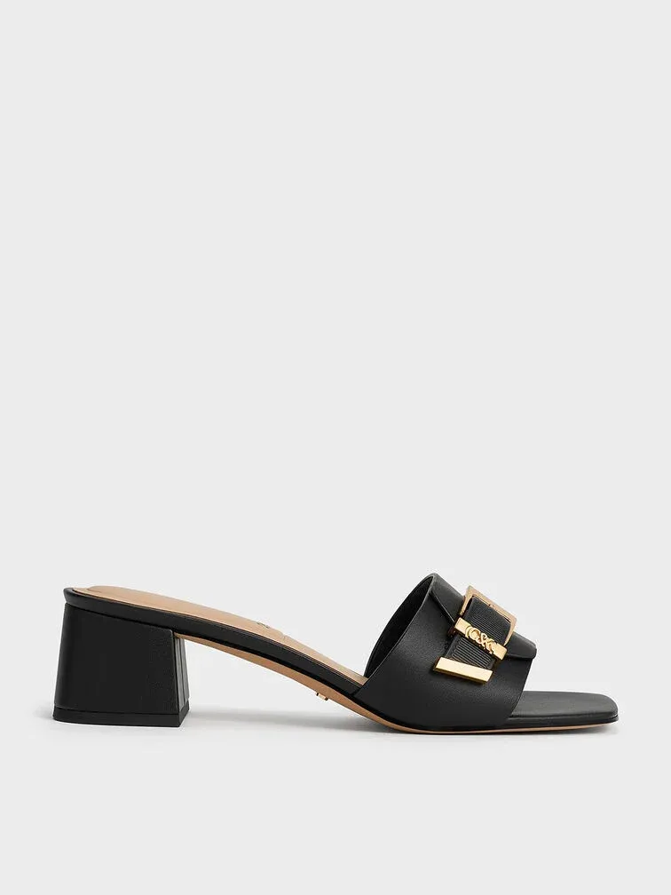 You will be grateful to have these sleek mules on hand. Featuring wide straps that are adorned by metallic belted details, the polished silhouette will instantly elevate any outfit. Its sophisticated black leather finish will work perfectly for elevated events and casual brunch dates alike, while the block heels provide a comfortable lift to the frame.