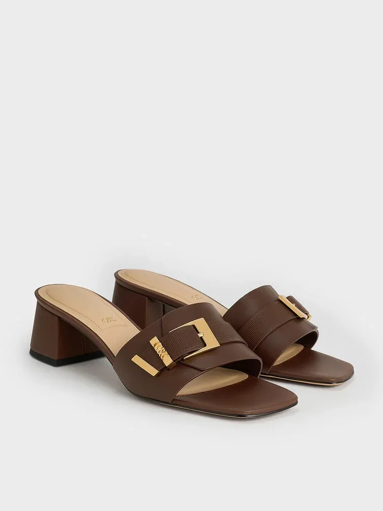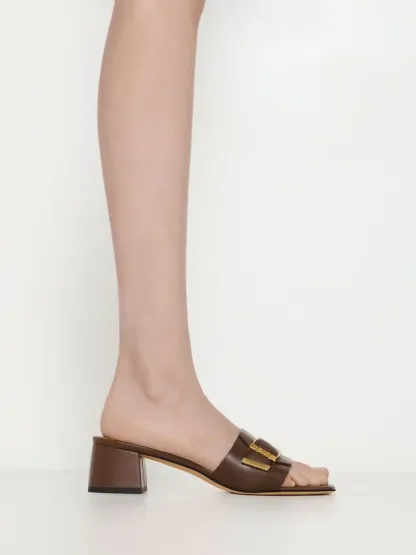These mules are perfect for whenever your outfit needs more polish. Belted straps elevate the casual open-toe style, giving it a sophisticated appearance. Made out of dark brown leather, they will be a versatile staple for many seasons to come. As they also sit on block heels, they will provide a subtle, flattering height boost to your frame.