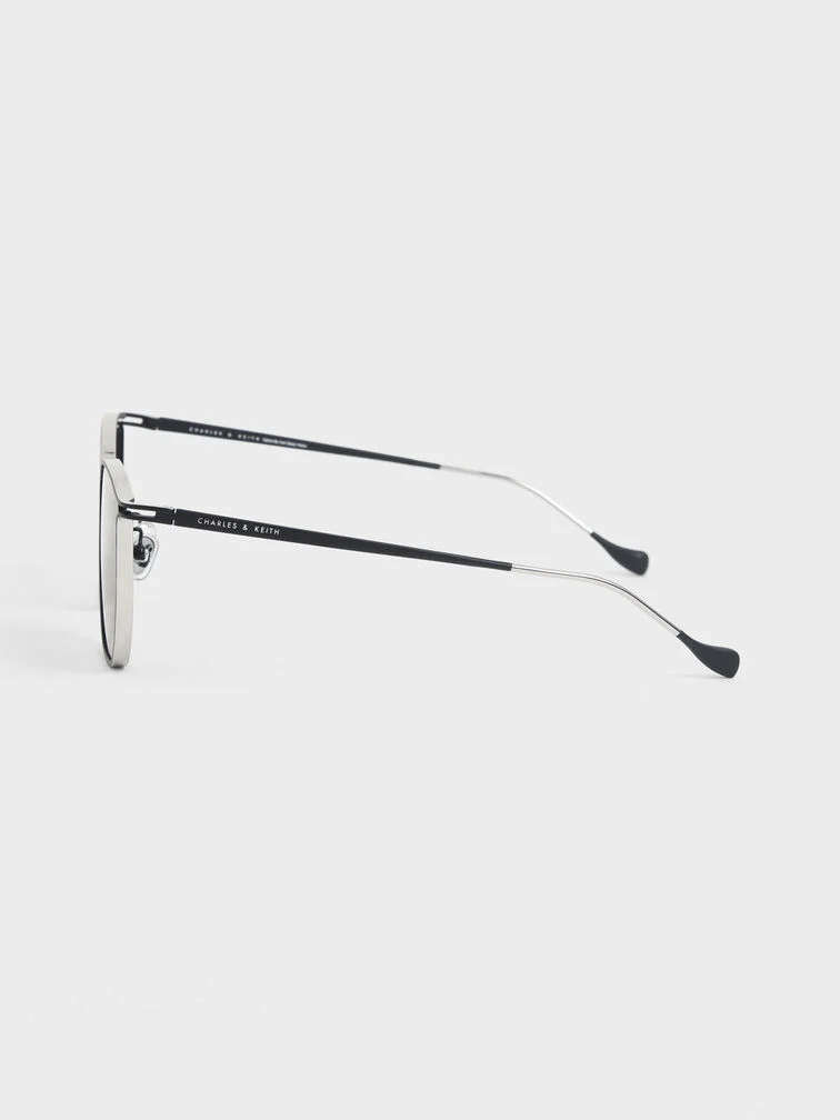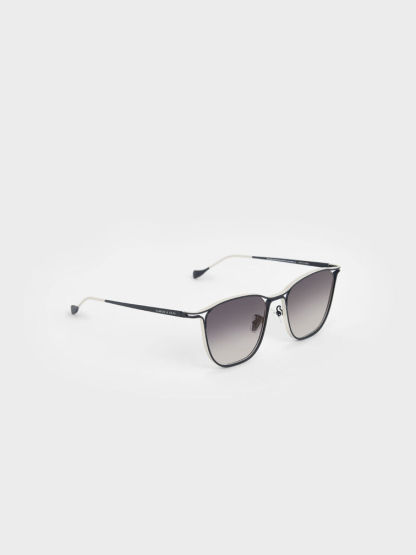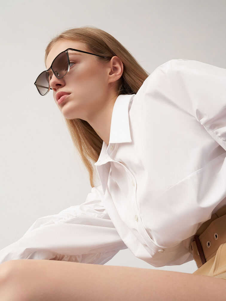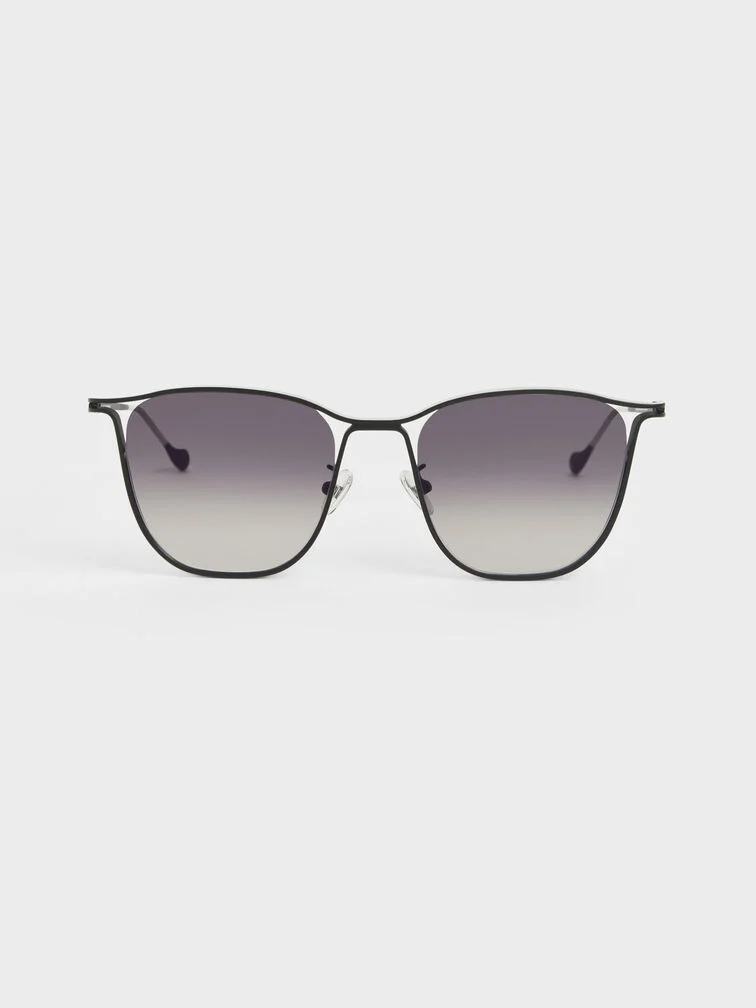 Put these sunglasses on for a confidence boost. The two-tone design features a sleek stainless steel black-and-silver wire frame and matching gradient-tint lenses that are simply irresistible. The classy butterfly frame is best suited to complement oval, square, and heart-shaped faces. For a modern look, style these shades with a black tailored playsuit, some sculptural heel mules, and a boxy bag. Put your hair up to really show them off.