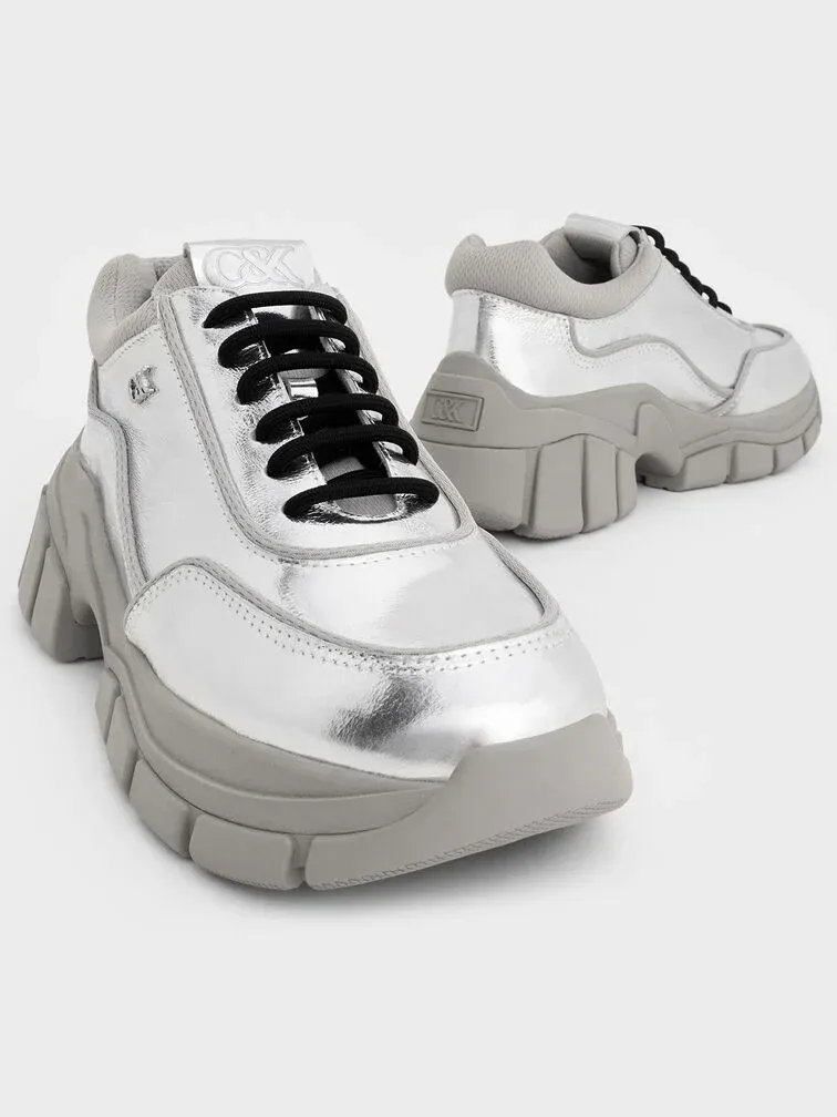With their exaggerated proportions, these chunky sneakers are designed to stand out. They feature a striking metallic finish with a distressed leather effect, giving them an edgy, worn-in look. Despite this eye-catching detail, they remain versatile enough to complement a wide range of outfits, thanks to the understated elegance of silver. The chunky, curved soles provide a stylish height boost while adding an extra spring to your step.